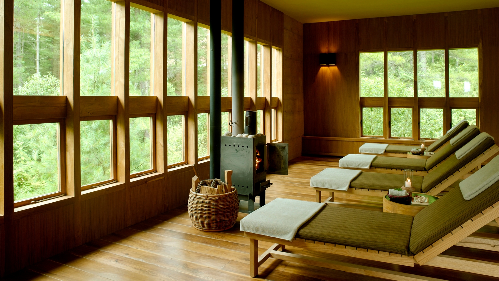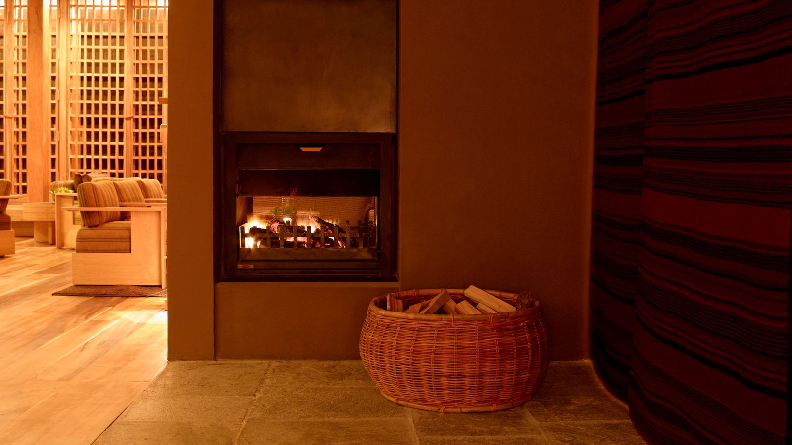 This impressive lodge features 24 suites, each with a combined lounge and bedroom and traditional wood-burning stove. Centred by a large flagstone courtyard, a lime-washed stone pavilion houses the living and dining room facilities with floor-to-ceiling windows, a library and an outdoor terrace overlooking a small stream.