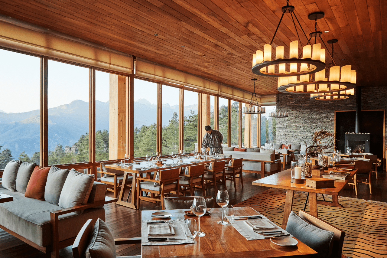 In the scenic Paro valley, a place of small villages and terraced fields, sits the Six Senses Paro. The new building sits on the site of an abandoned 16th century stone fortress that inspired the name of the lodge; “Stone Ruins”. The property has been designed to mimic the old style of the fortress and built using locally-cut stone. Inside the decor is calm and serene with simple, contemporary wooden furniture finished with fabrics in rich earthy tones. The hotel offers 16 spacious suites and a small collection of villas, all with beautiful valley views and each featuring a roaring log burner for those chilly evenings. The ensuite bathrooms, in keeping with the rooms themselves, are spacious and offer an understated luxury with all the comforts and amenities you’d expect. There’s indoor and outdoor dining at the hotel and two bar options – each has spectacular views out to the natural world. These social areas also feature log fires for a cosy and comforting atmosphere. The outdoor dining area is large, with a floor of huge stone flagstones. Experience complete relaxation in the hotel’s Six Senses Spa, a haven of warmth and tranquillity. Revel in the outdoor sauna and cool dip, the yoga room and meditation and relaxation areas. There’s also a beautiful indoor swimming pool, housed within a stone space, one wall made of glass and with a curved wooden ceiling, an architecturally stunning room.