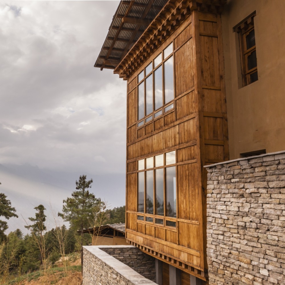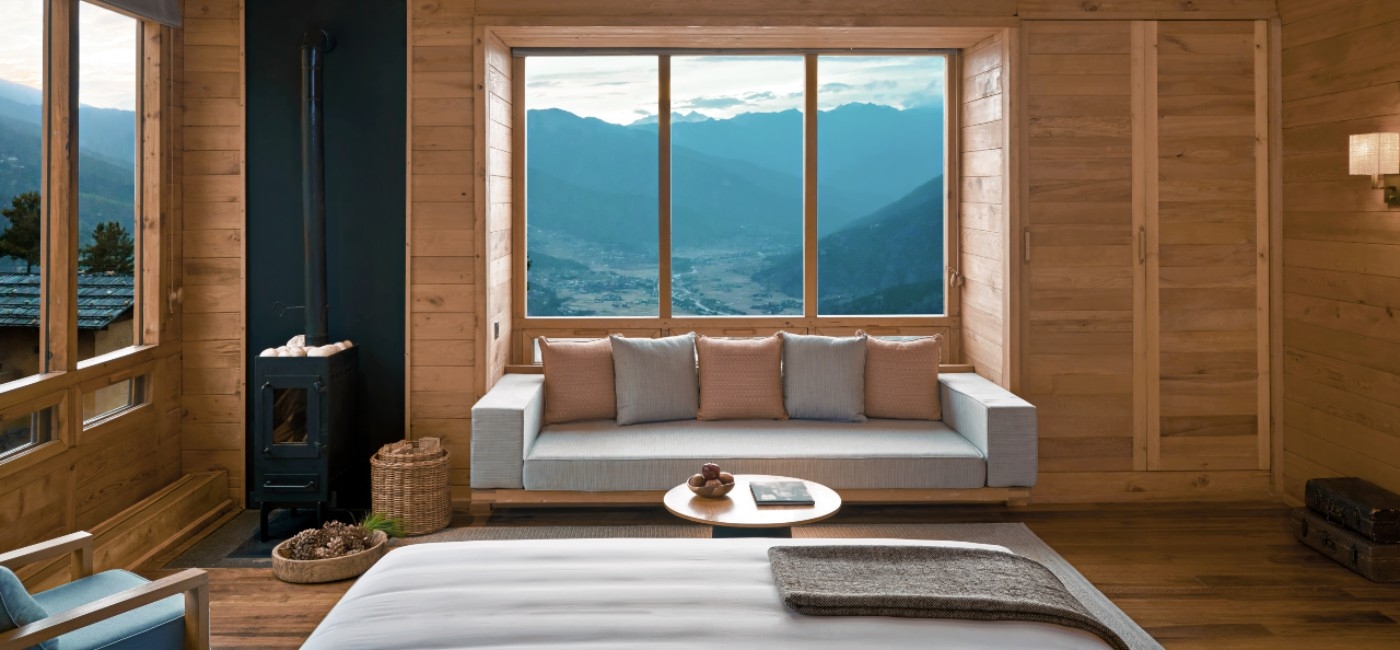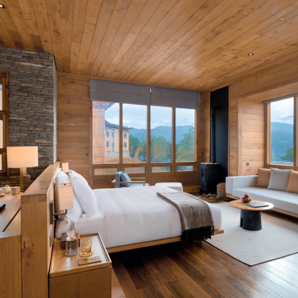 In the scenic Paro valley, a place of small villages and terraced fields, sits the Six Senses Paro. The new building sits on the site of an abandoned 16th century stone fortress that inspired the name of the lodge; “Stone Ruins”. The property has been designed to mimic the old style of the fortress and built using locally-cut stone. Inside the decor is calm and serene with simple, contemporary wooden furniture finished with fabrics in rich earthy tones. The hotel offers 16 spacious suites and a small collection of villas, all with beautiful valley views and each featuring a roaring log burner for those chilly evenings. The ensuite bathrooms, in keeping with the rooms themselves, are spacious and offer an understated luxury with all the comforts and amenities you’d expect. There’s indoor and outdoor dining at the hotel and two bar options – each has spectacular views out to the natural world. These social areas also feature log fires for a cosy and comforting atmosphere. The outdoor dining area is large, with a floor of huge stone flagstones. Experience complete relaxation in the hotel’s Six Senses Spa, a haven of warmth and tranquillity. Revel in the outdoor sauna and cool dip, the yoga room and meditation and relaxation areas. There’s also a beautiful indoor swimming pool, housed within a stone space, one wall made of glass and with a curved wooden ceiling, an architecturally stunning room.