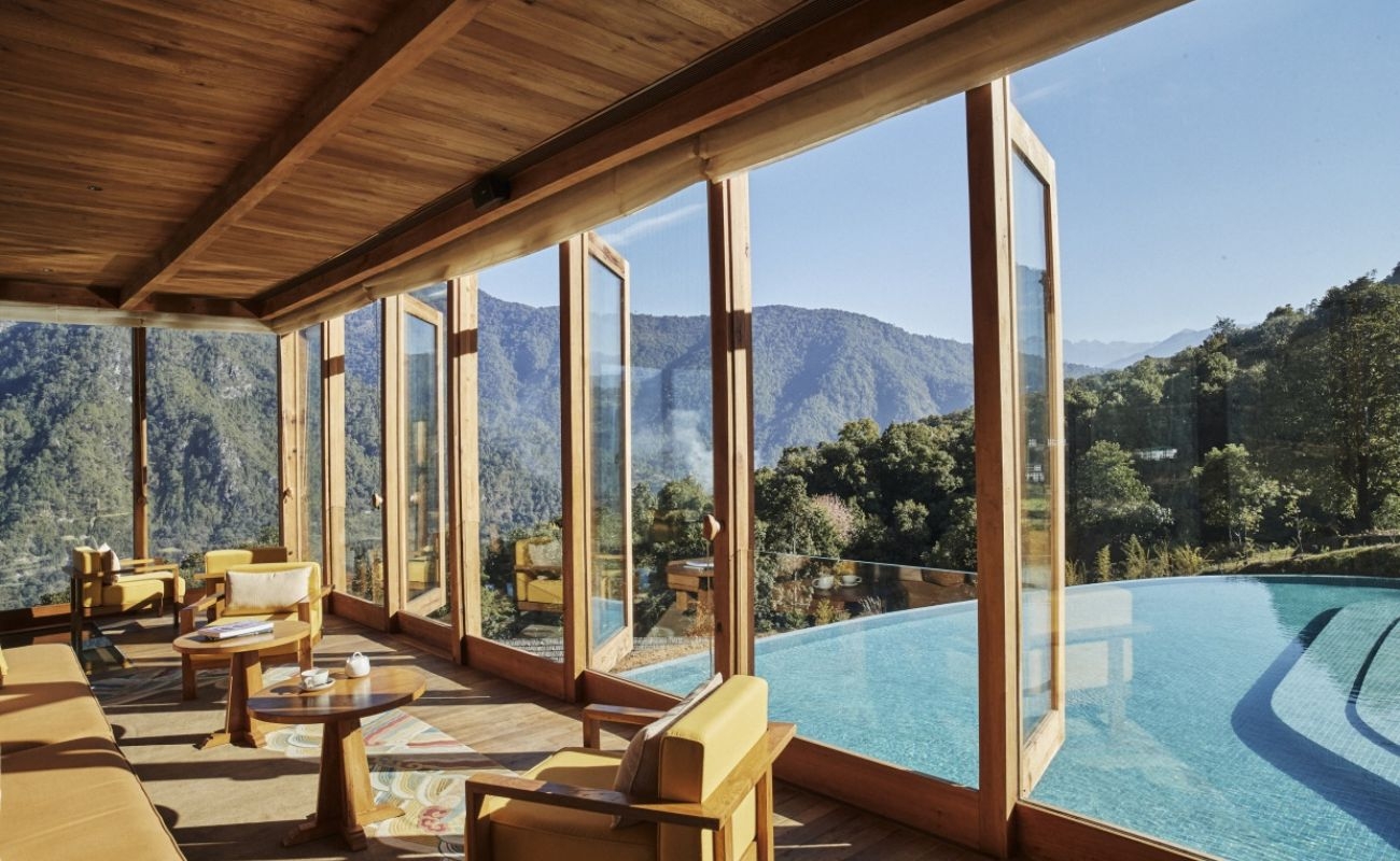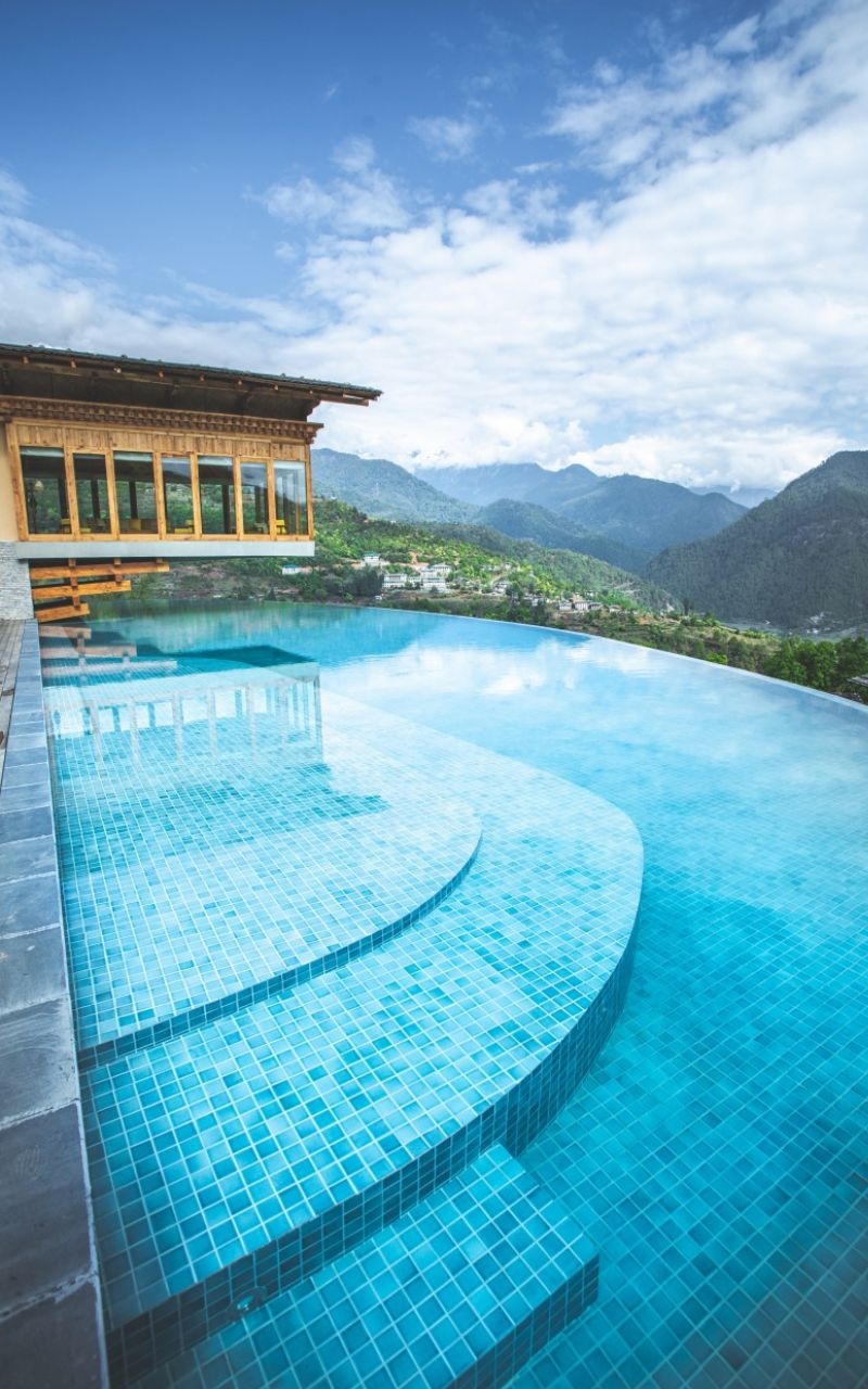 The communal areas of the lodge include the living room and lounge and the exceptional Ari restaurant that serves up inspired cuisine, influenced by both international and Bhutanese flavours. The restaurant is situated indoors but there’s also an outside dining area where fires burn late into the night so that guests can spend the evenings under the stars. The Six Senses spa and wellness centre is a haven of rejuvenation and relaxation. There are three treatment rooms, a gym, two meditation huts and yoga facilities. The outside heated pool, curved and raised is a wonderful place to relax or enjoy some exercise with stunning views.