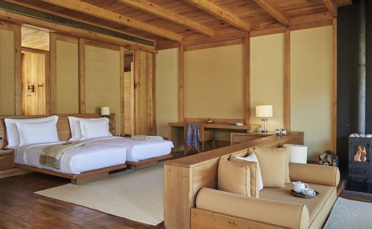 The Punakha Six Senses, affectionately known as the Flying Farmhouse sits high on the hillside, the raised building overlooking the valley, pine forests, streams and fluttering prayer flags below. This is a truly beautiful lodge that harnesses a rustic charm, echoing its rural surroundings. The main building of the hotel is built of sandstone, flagstone floors, grey tiled pitched roofs and wooden beams. Inside the contemporary design is simple yet welcoming. Large picture windows bring the outside, inside and the warm tones of the wood panelled walls and wooden furniture give a welcoming feeling.