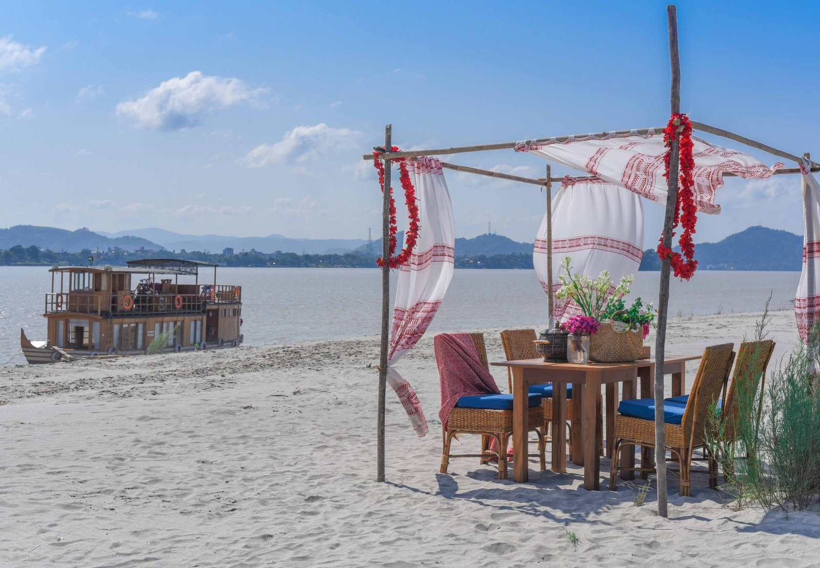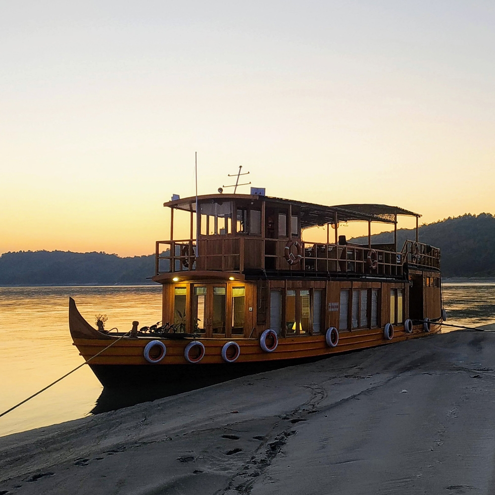 The MV Rudra Singha is a beautifully crafted traditional Assamese pansoinau, a large flat-bottomed wooden boat, perfect for exploring the rural countryside in a unique way. This sturdy and expertly built private houseboat is designed to glide effortlessly through the shallowest channels of India‘s Brahmaputra River.