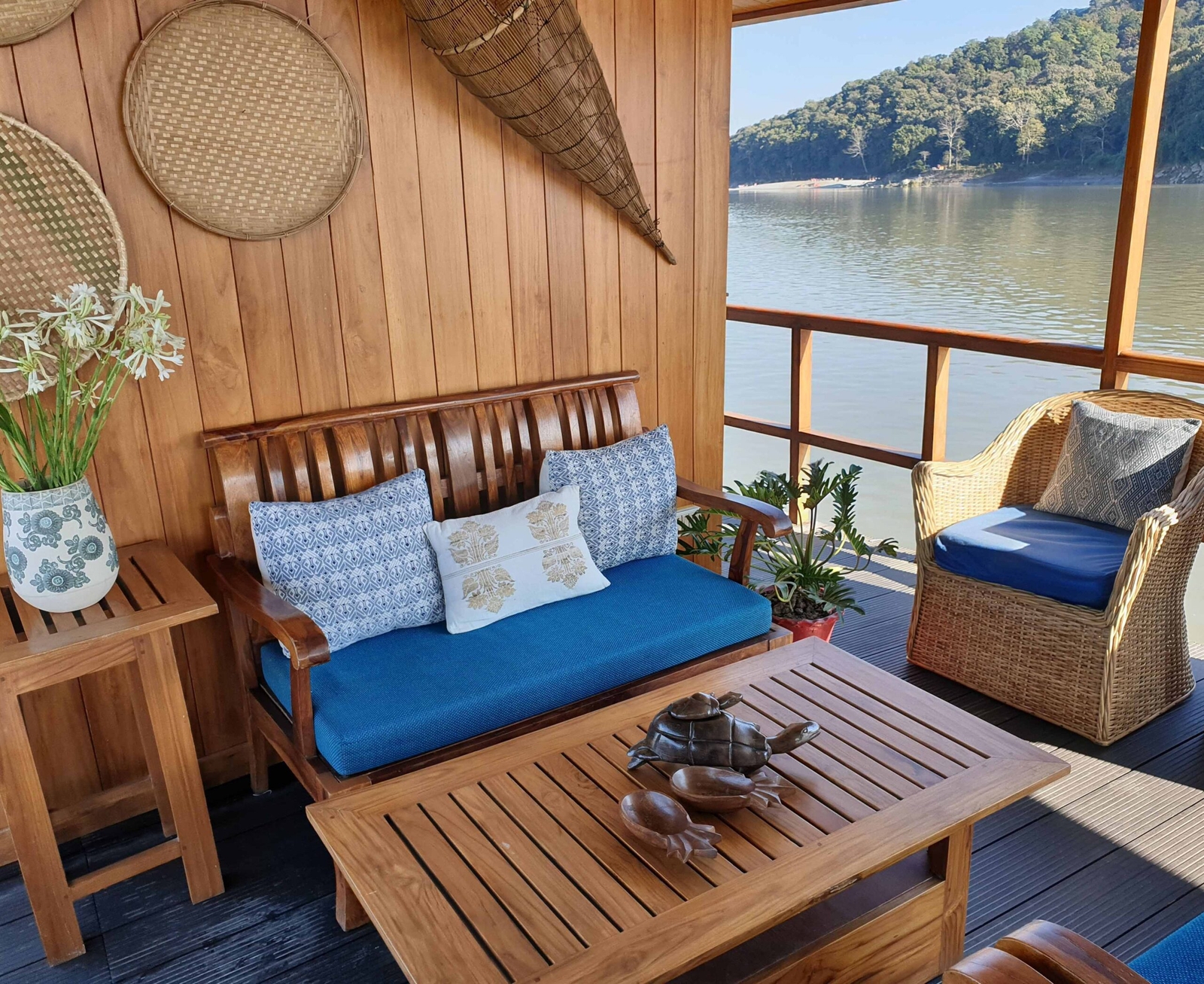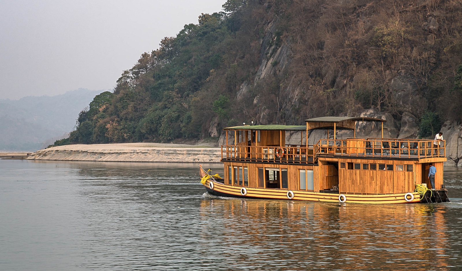Your spacious en-suite cabin features intricate detailing by local artisans and large floor-to-ceiling glass windows. From your comfortable private lounge, enjoy the views of the river and its scenic banks. Relax on the upper deck, soaking up the sun as the vessel gently drifts along the mighty river. Savour delicious meals prepared by the resident chef, served either on deck or on a secluded beach.