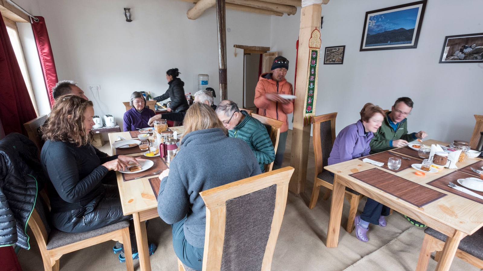 Accommodation is fairly basic, but comfortable and warm. Three twin bedrooms are en suite, while a further eight rooms share bathrooms. In winter there is no running water and hot water for washing is delivered in buckets. An assortment of Ladakhi, Indian and Continental cuisine is served in the communal dining room in the main house.
