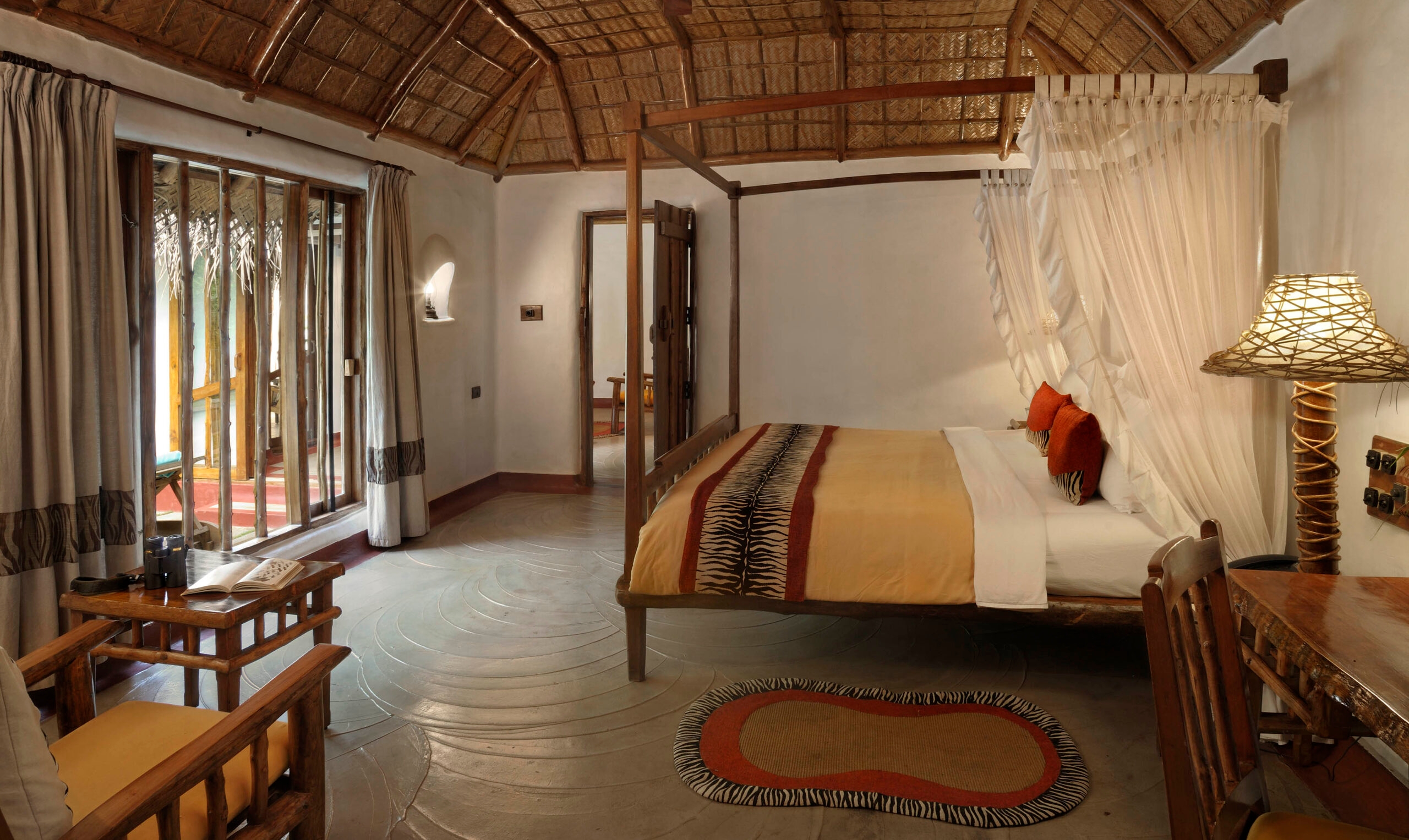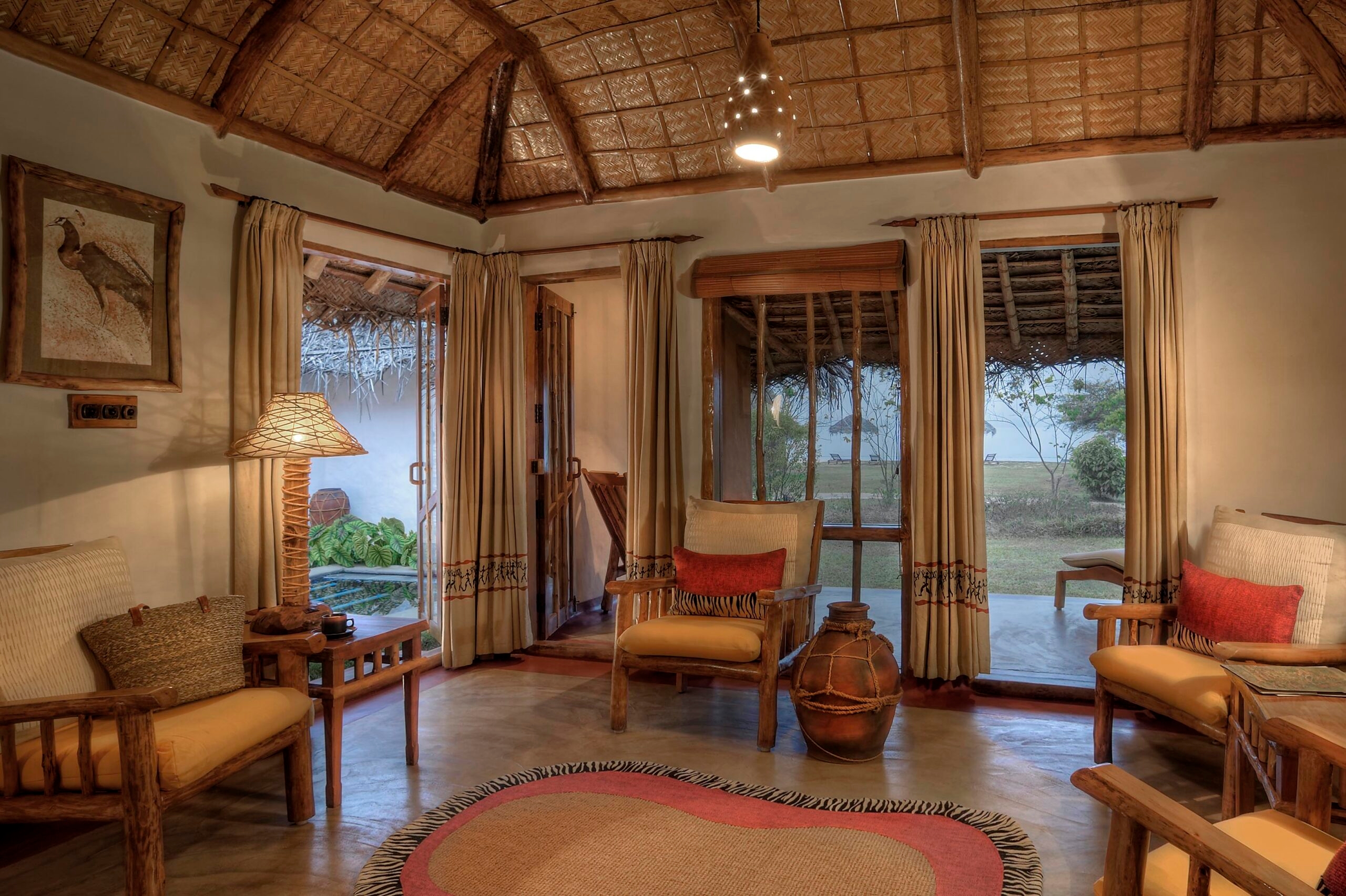 Although each room has minor design variations, all share the same elegant and comfortable features. The Safari Hut includes separate living and dining areas, an en-suite bedroom, and a private courtyard with a shallow water-jet pool, providing a perfect retreat for privacy. Drawing inspiration from the traditional Kuruba homes, the Pool Huts are ideal for peace and tranquility. The Pool Reserve features spacious living and dining areas, a private courtyard with a heated pool, and a unique Star Bed for stargazing under the clear Kabini night sky.