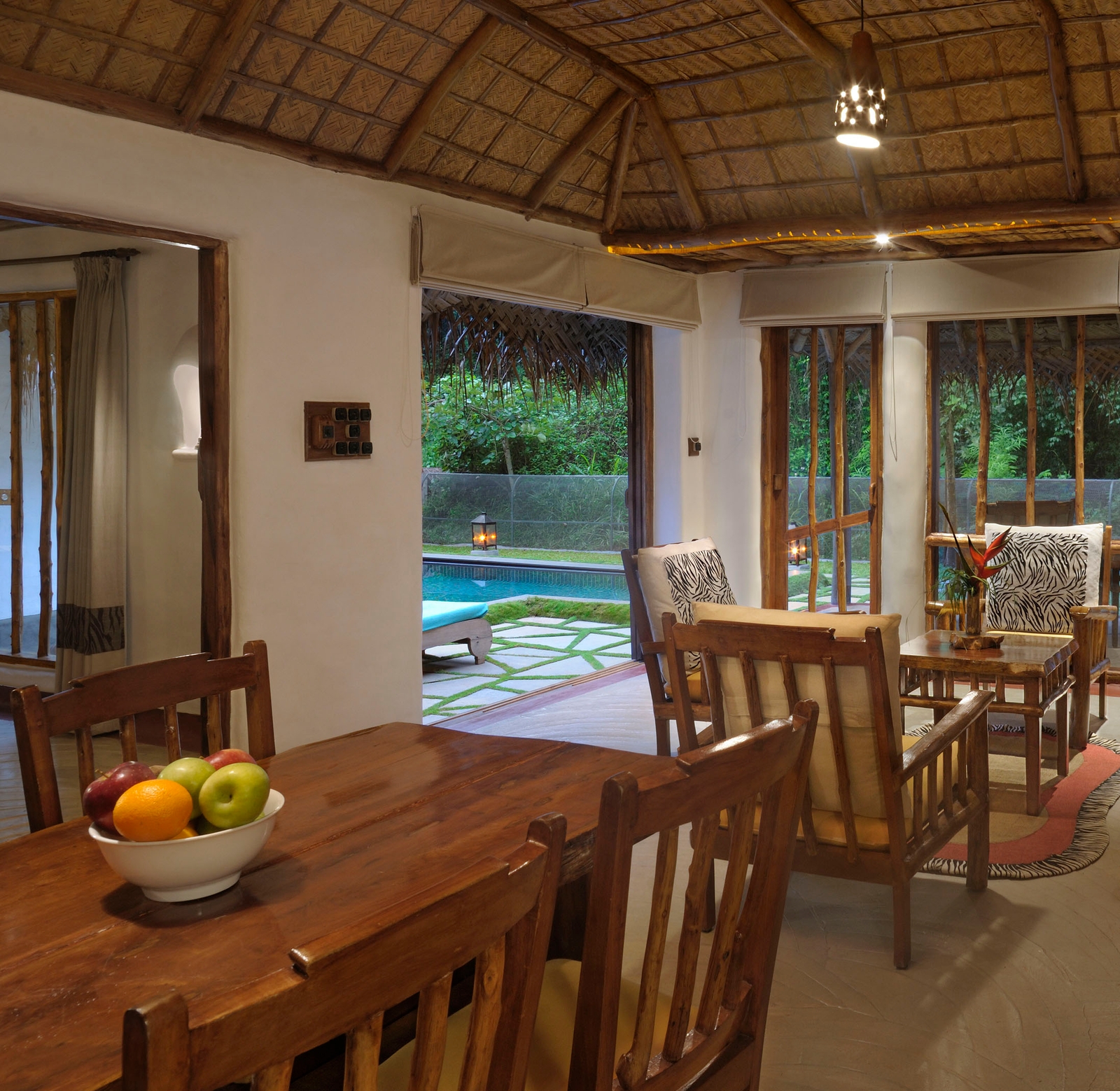 Although each room has minor design variations, all share the same elegant and comfortable features. The Safari Hut includes separate living and dining areas, an en-suite bedroom, and a private courtyard with a shallow water-jet pool, providing a perfect retreat for privacy. Drawing inspiration from the traditional Kuruba homes, the Pool Huts are ideal for peace and tranquility. The Pool Reserve features spacious living and dining areas, a private courtyard with a heated pool, and a unique Star Bed for stargazing under the clear Kabini night sky.