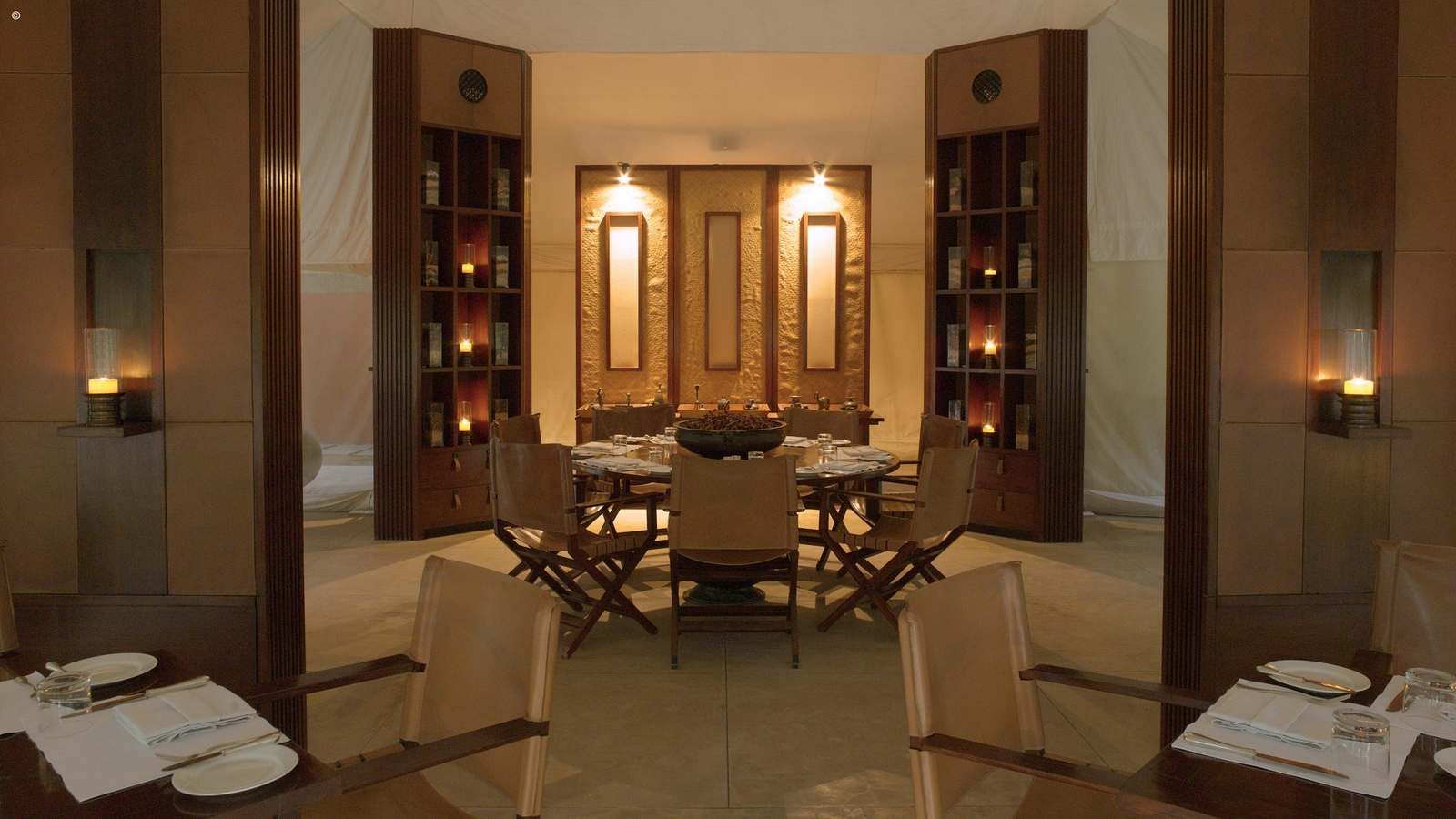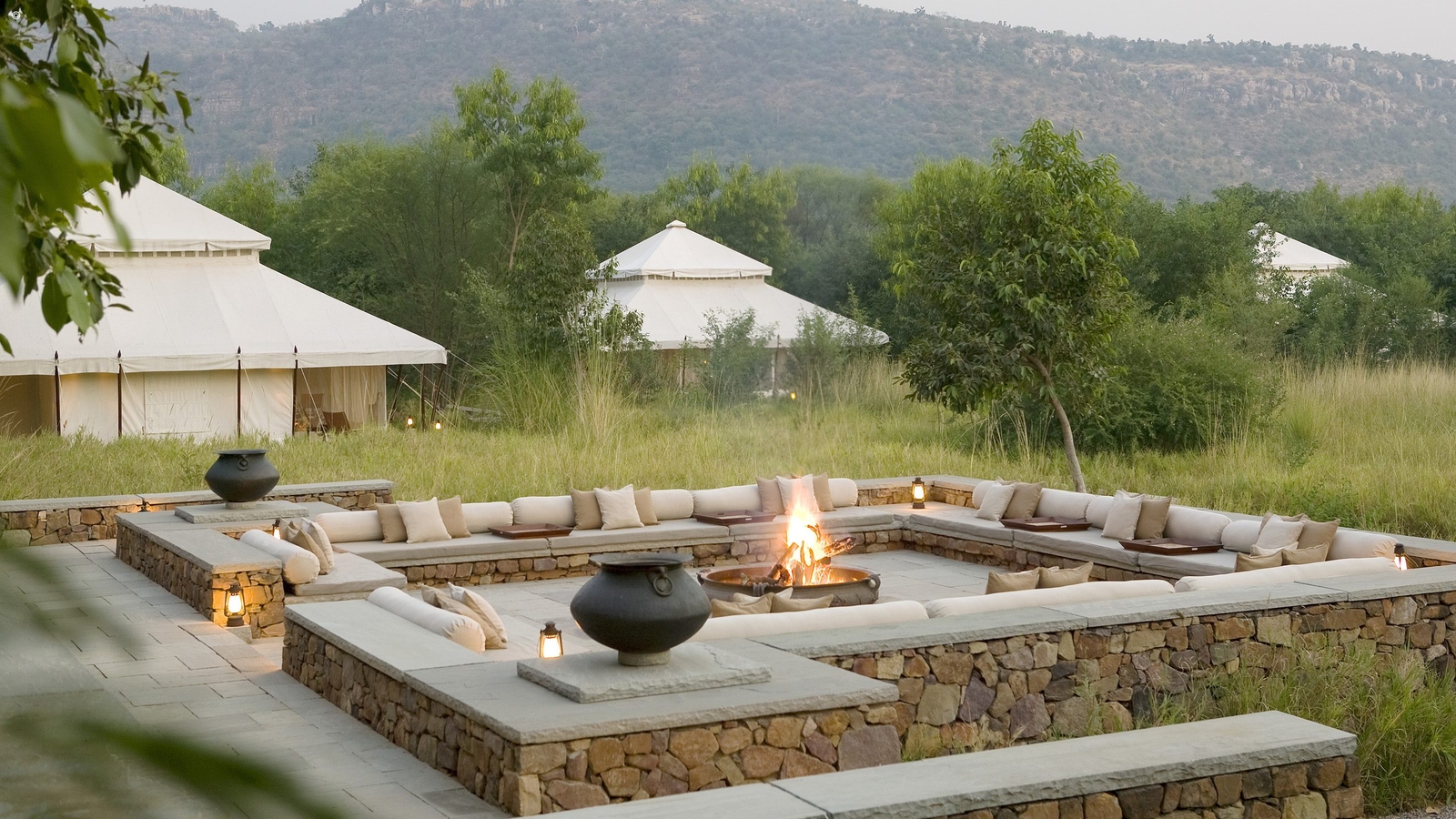 An outdoor fireplace is the heart of the camp, where stories of the day’s game drives are shared over G&Ts each evening. Other communal areas include the cool swimming pool and dining tent with its daily changing menu of local Rajasthani specialities or culinary concepts from Kerala made with vegetables and herbs grown in the camp’s organic garden.