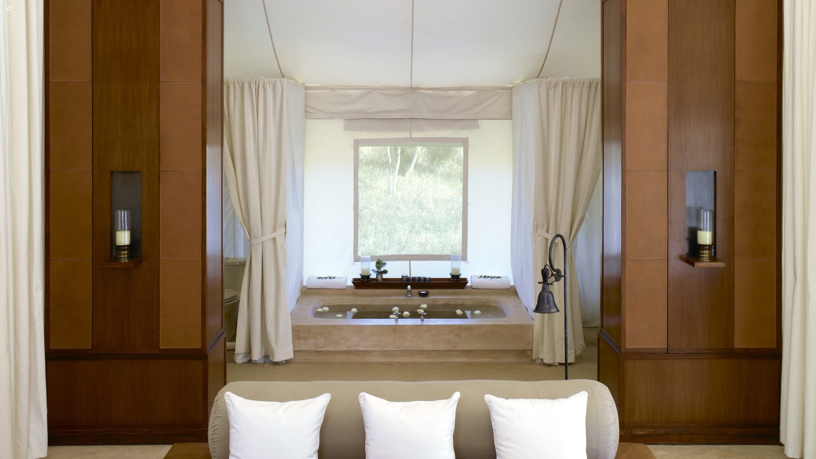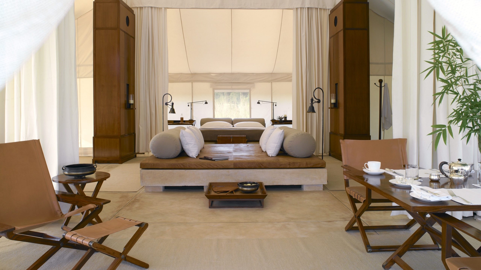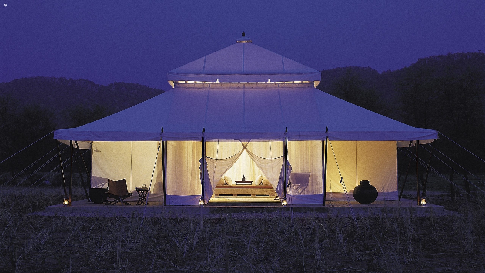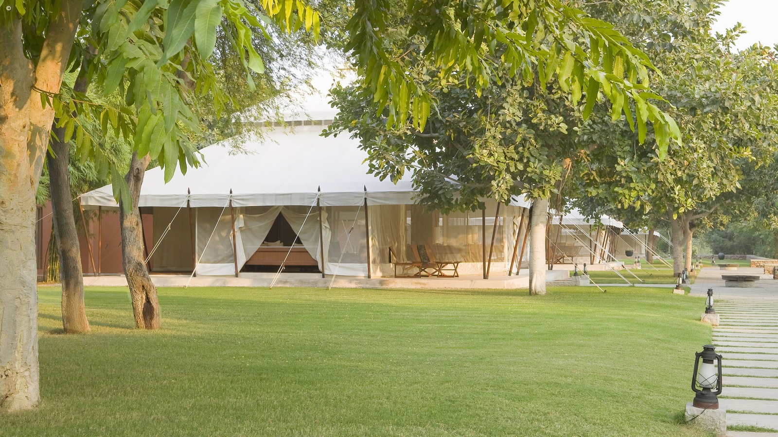 There are ten sumptuous tents spread out in the sun-dappled brushwood forest, each echoing Mughal pavilions with high canopied ceilings, huge beds and a sunken marble bathtub. White cotton curtains divide the sleeping, living and dressing areas with a sprawling daybed at the tent’s centre.
