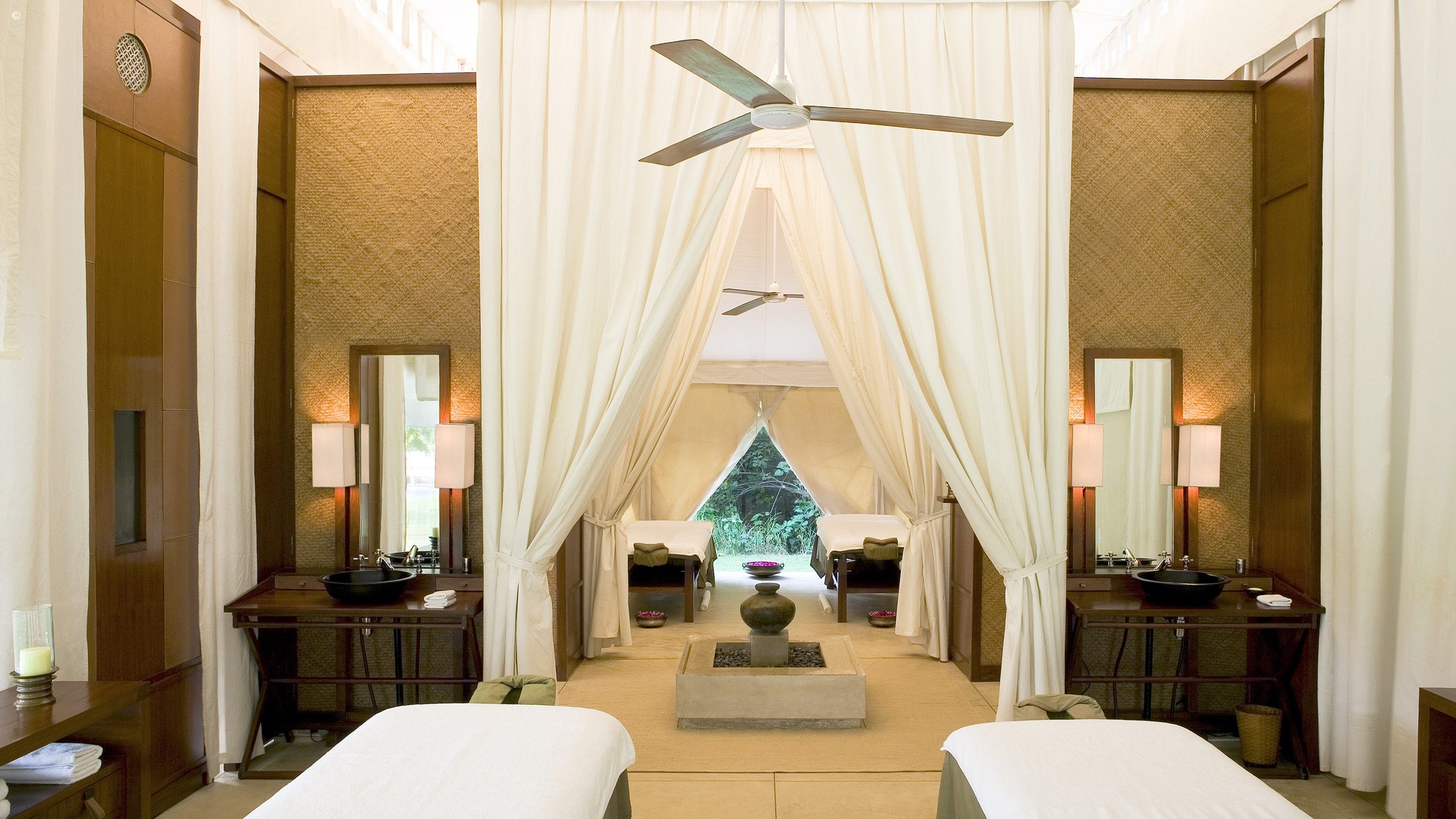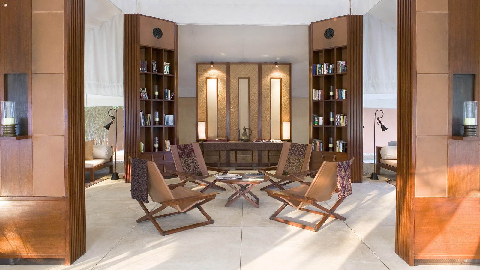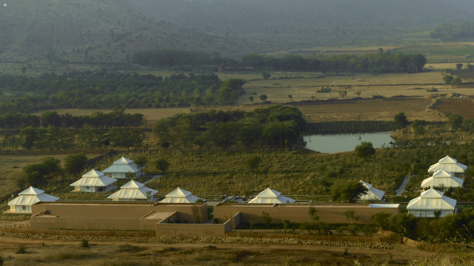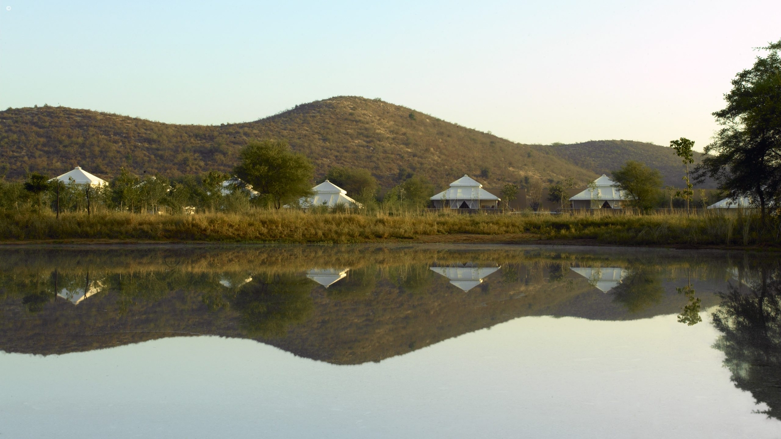 There are ten sumptuous tents spread out in the sun-dappled brushwood forest, each echoing Mughal pavilions with high canopied ceilings, huge beds and a sunken marble bathtub. White cotton curtains divide the sleeping, living and dressing areas with a sprawling daybed at the tent’s centre.