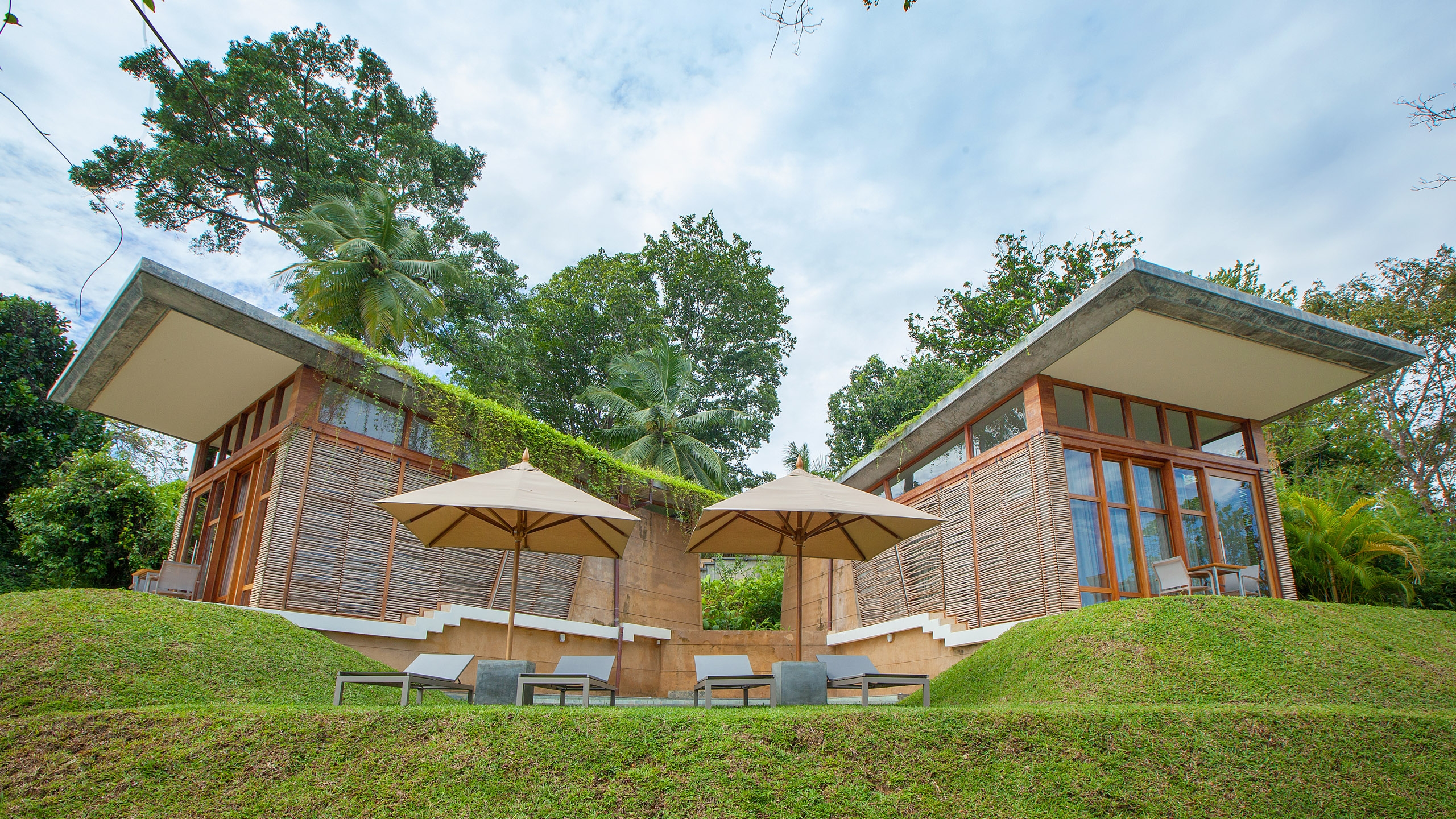 Sustainability is one of the core values of Tri. Buildings occupy natural folds between the trees and living roofs are planted with native creepers and plants such as water grass and dwarf bamboo. A blanket of tea, cinnamon, lemongrass and frangipani leads down to the lake where a forest path of endemic trees and mangroves attract butterflied and birds.