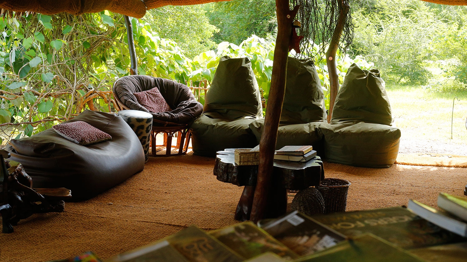 Communal areas within the camp include a lounge tent with comfy beanbag chairs, and a jungle bar. The majority of the camp is powered by solar energy and various tree planting schemes and community projects are supported.
