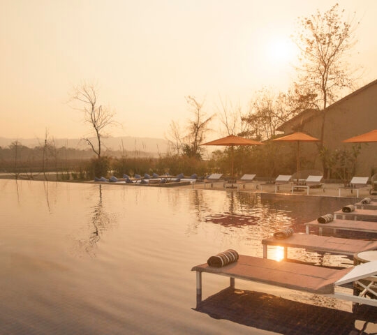 Later, you’ll canoe down a tranquil river, glimpsing wildlife drifting along its banks, including curious crocodiles, while birds, like kingfishers, swoop in from above. Your excursion culminates with a refreshing sundowner along the Rapti River.