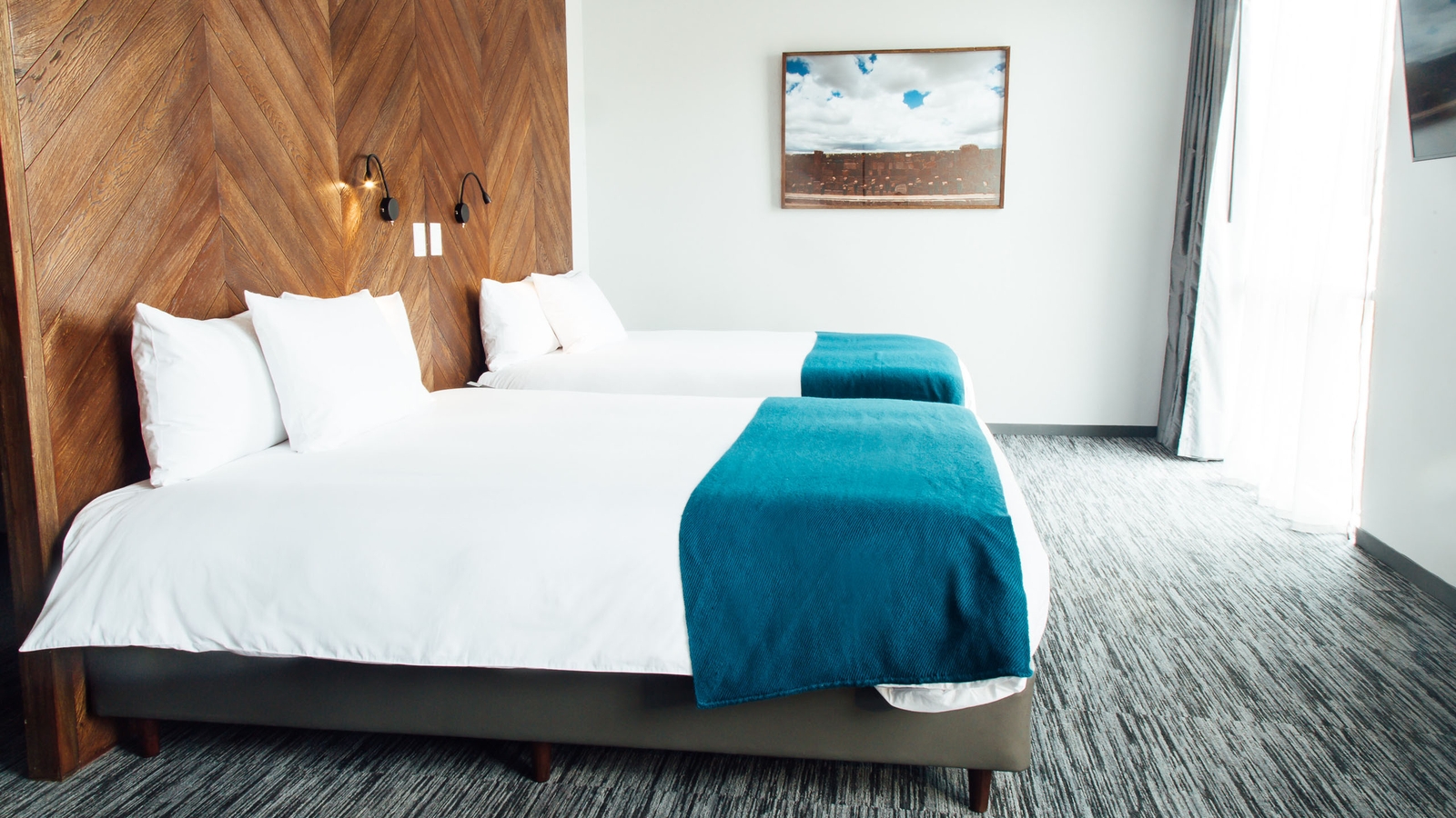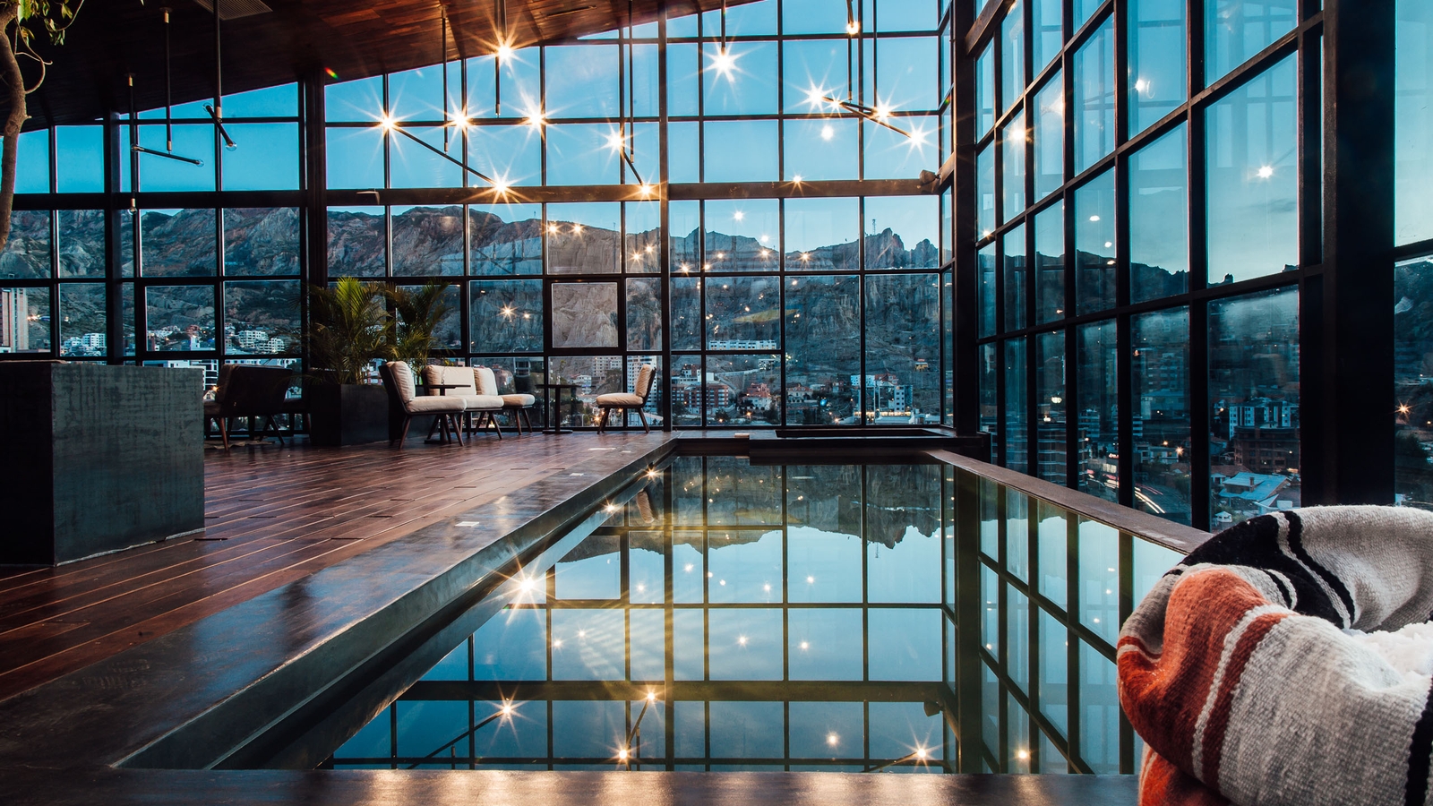 The hotel, which is shaped like a parallelogram, is clad in native Bolivian wood and Comanche stone from a village of the same name 70km outside the city. Inside is no less impressive with photography and artwork from Bolivian artist, Gastón Ugalde, throughout. There are 53 modern, spacious rooms that look out over the mountains that surround the city, that are simple and sophisticated in design.