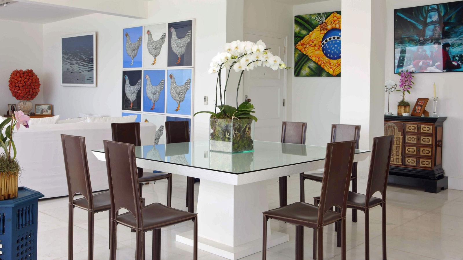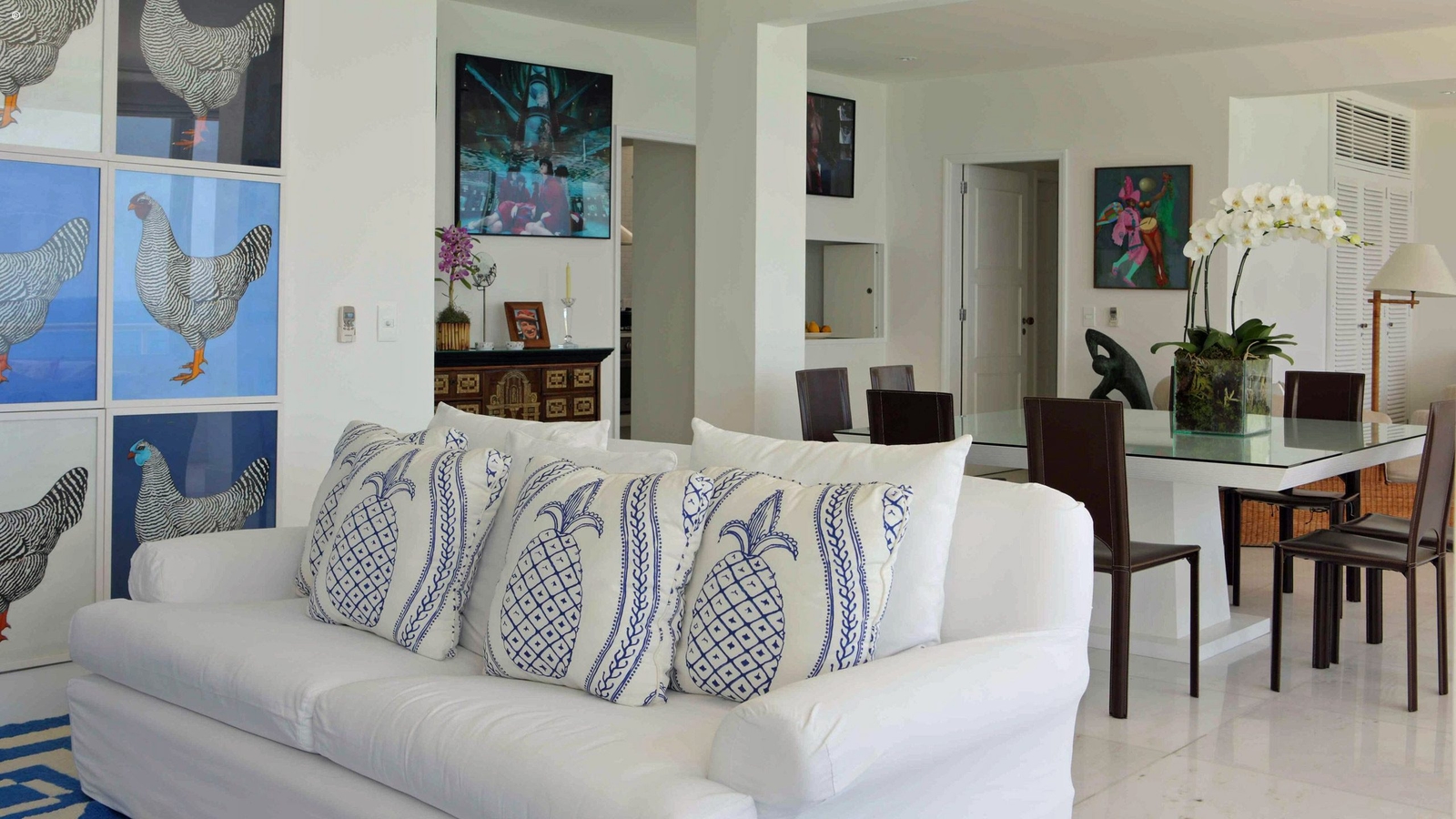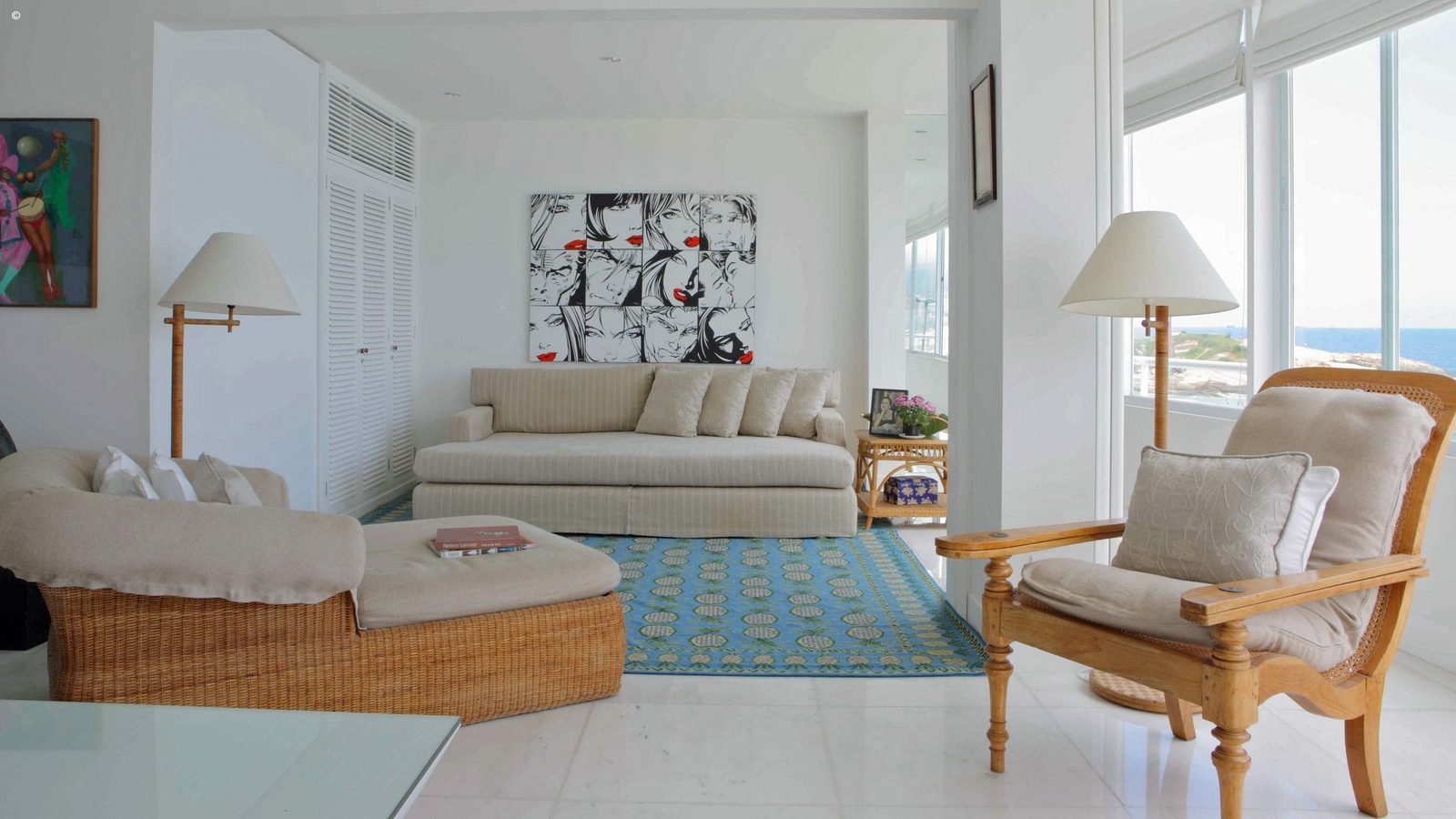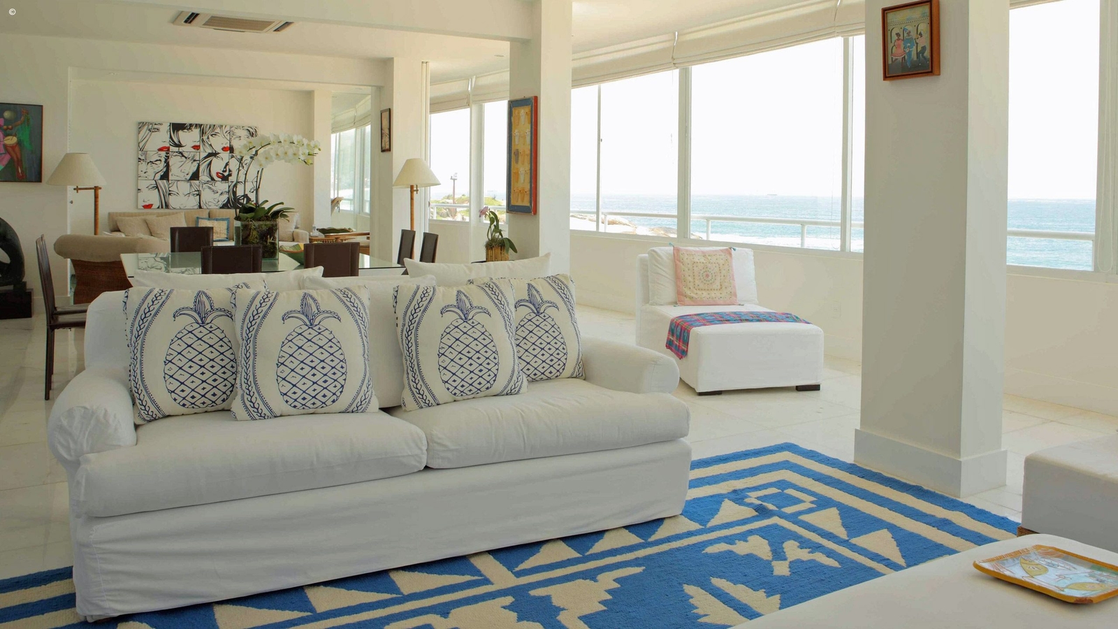 With views of Ipanema and Leblon beaches as well as the Dois Irmãos peaks, the apartment is stylishly decorated and reflects the colours pouring through its windows. With an appealing palette of cerulean blue and white the walls are adorned with modern art pictures and sculptures that reflect the owners eclectic and vibrant taste.