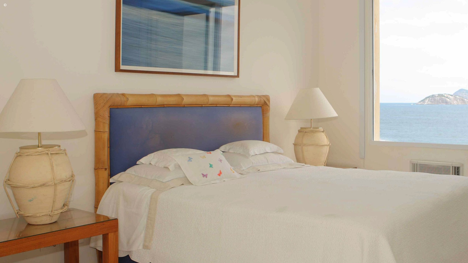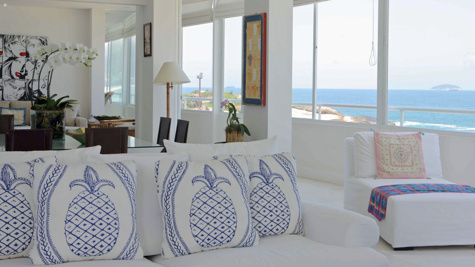 With views of Ipanema and Leblon beaches as well as the Dois Irmãos peaks, the apartment is stylishly decorated and reflects the colours pouring through its windows. With an appealing palette of cerulean blue and white the walls are adorned with modern art pictures and sculptures that reflect the owners eclectic and vibrant taste.