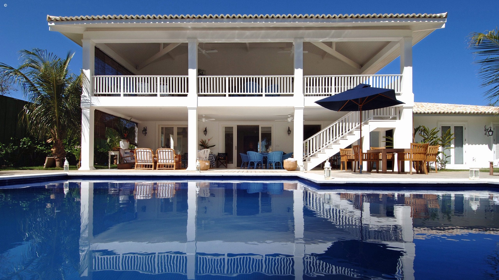 A luxurious five bedroom Plantation style house (3 doubles, 2 twins) designed by one of Brazil’s most prominent interior designers located on the Terravista estate, a 15-minute drive to Trancoso. Recently finished to the highest standard, the house has a magnificent kitchen and dinning room downstairs with wide French doors giving on to the deck and large pool. The upstairs is taken entirely by a vast open plan sitting room and shaded terrace where meals can be served. Tennis courts and the best 18 hole golf course are available right on the door step.