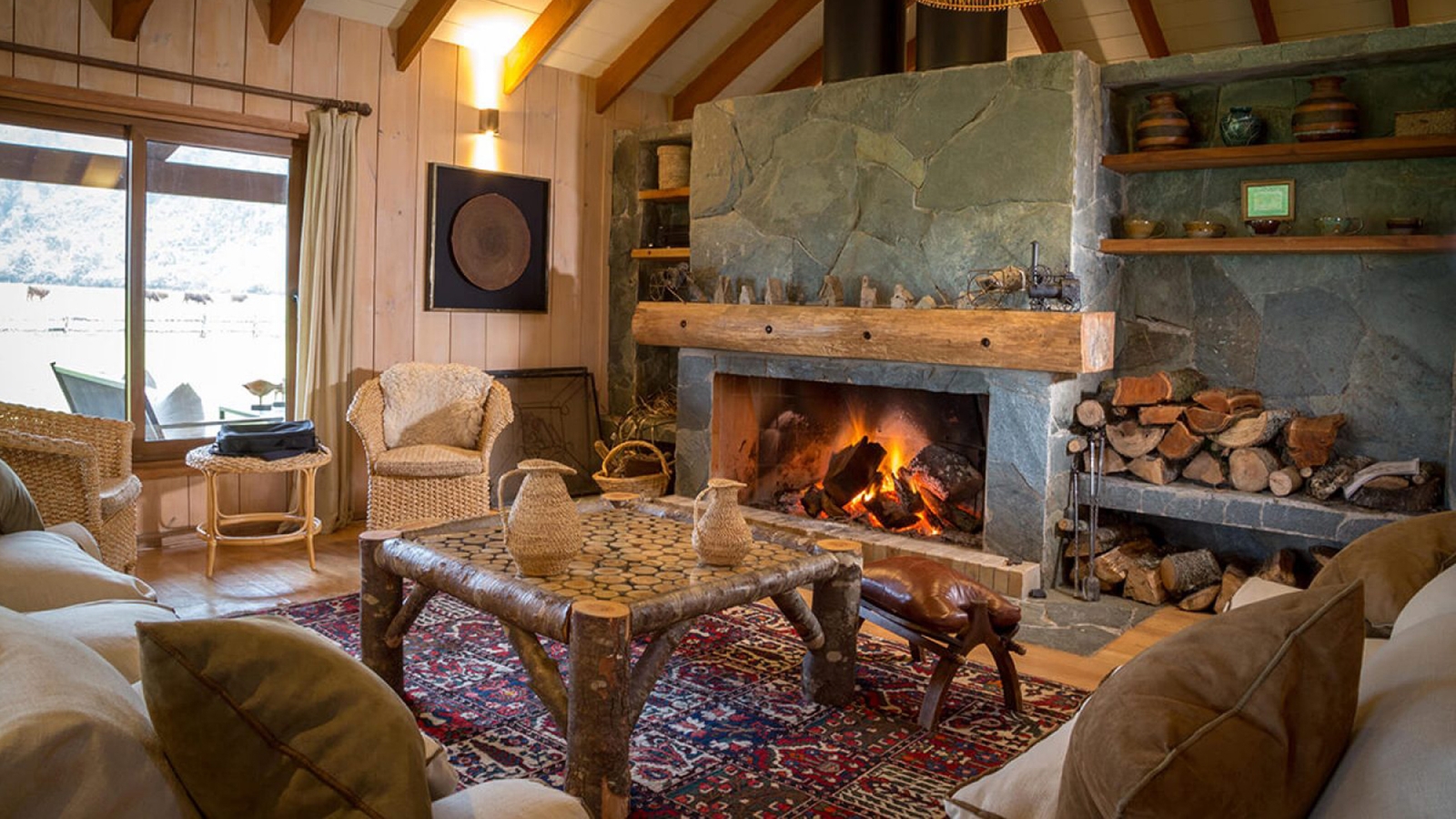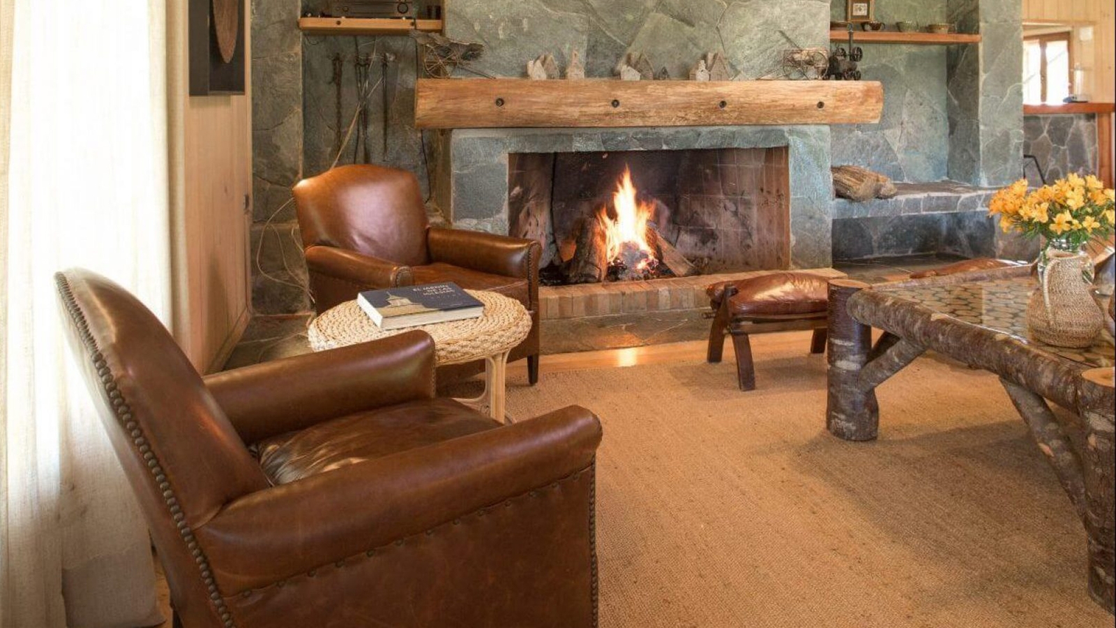 The architecture of the hotel was created with the traditional barns and stables of southern Chile in mind, and the 16 rooms, each inundated with natural light, feature soft furnishings, colourful textiles, and timber beams. Unparalleled vistas of the Patagonian Andes or the gardens can be enjoyed from the rooms, as well as from the sweeping terrace, built off the main area of the hotel. A snug communal living room, centred around a grand stone fireplace, can also be found here, along with the on-site restaurant, El Mesón del Caulle, serving Patagonian classics and a hearty breakfast spread each morning.