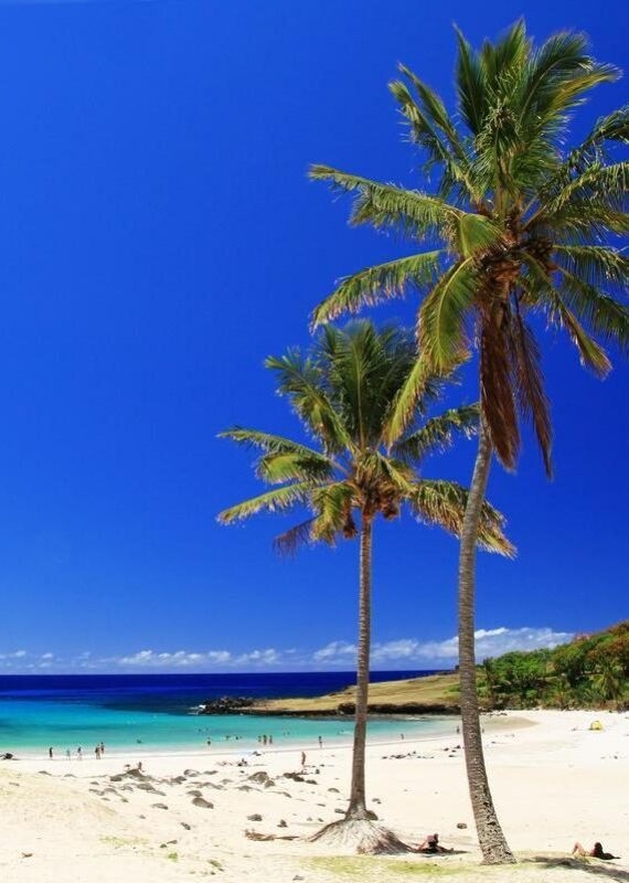Anakena on the northern coast is the island’s most popular beach – particularly during the southern hemisphere’s summer months – where white coral sand is lapped by the warm Pacific Ocean with coconut trees swaying in the sea breeze.