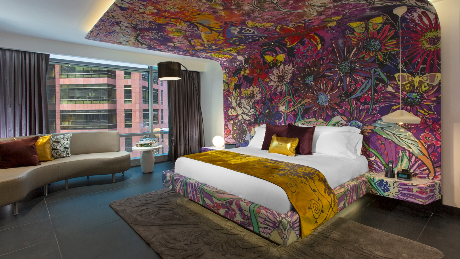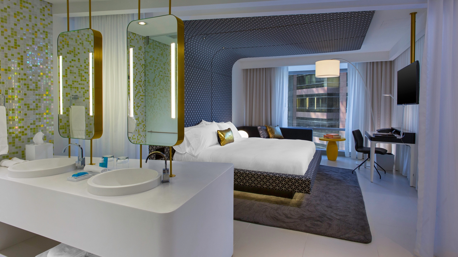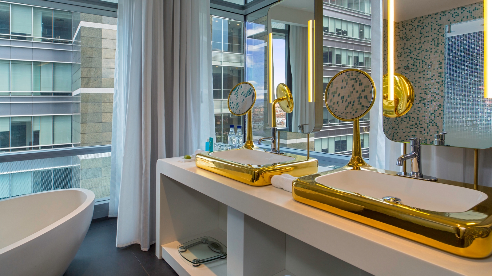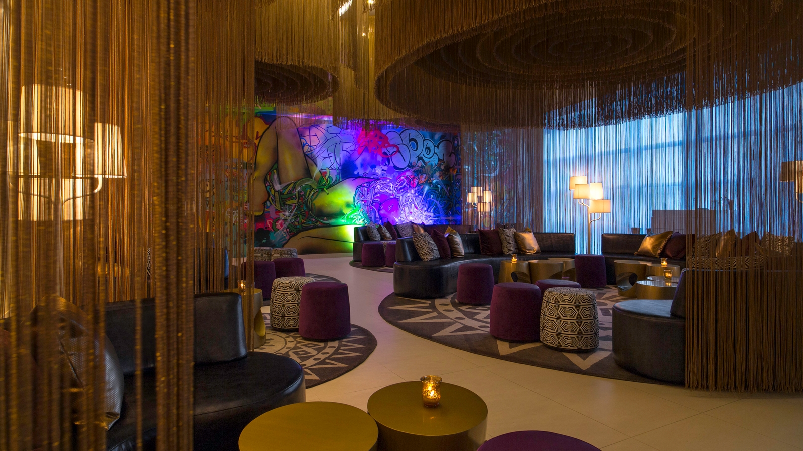 The W is inspired by the legend of El Dorado, a mythical chief who was covered in gold dust before setting sail on Lake Guatavita, into which his attendents threw gold and emeralds. There are several elements that allude to this magical tale throughout the hotel.