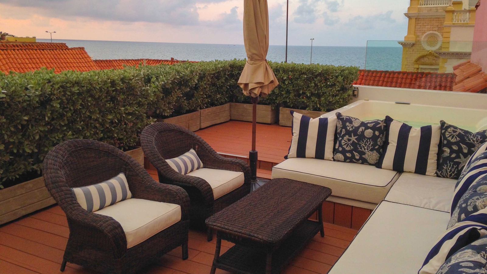 The small rooftop terrace is the perect place to watch the sunset. In one direction you have the colourful spire of Cartagena Cathedral and the high rises of Boca Grande in the distance, and in the other you have the pale pink facade of the theatre, beyond which are the vast waters of the Caribbean.