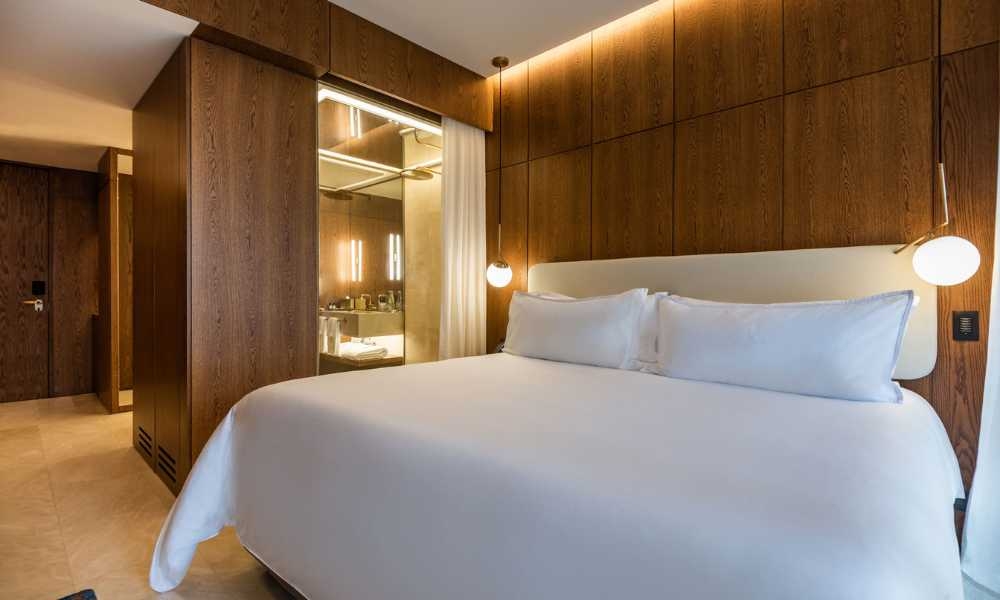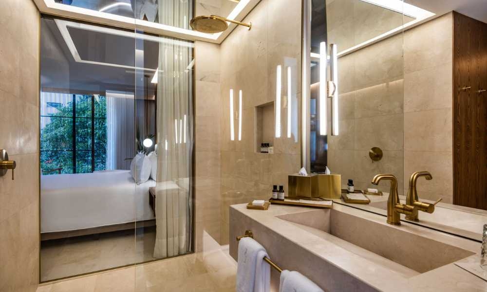 The hotel boasts four categories of guest suites ranging from the cosy, yet spacious standard suites to the larger presidential suites with living area, two bathrooms and luxury jacuzzi. The rooms are decorated within the same style as the hotel with chic wooden signature walls, marble floors and large windows draped with neutral toned luxury linen.