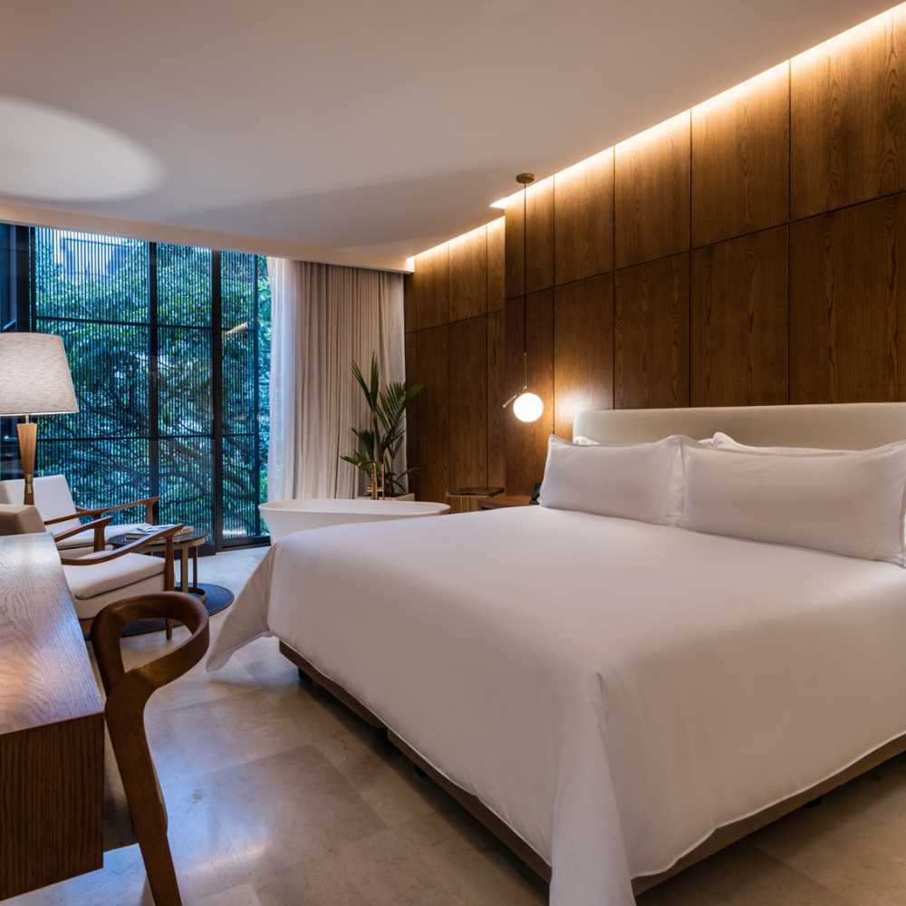 The social areas are spellbinding with huge stairways and auditorium style reception that are punctuated with lush green indoor plants contrasting against the simple, cool interiors. There’s a wonderful rooftop terrace complete with swimming pool and comfortable furniture to lounge on while enjoying the city view and perhaps a cocktail. Elcielo Restaurant is a signature cuisine restaurant based on neuroscience which has been applied to local products. Enjoy tasting menus that take you on sensory and gastronomic journeys designed to stimulate the senses. The chef’s team celebrates the tastes of Colombia using an exciting combination of ancient and modern techniques.