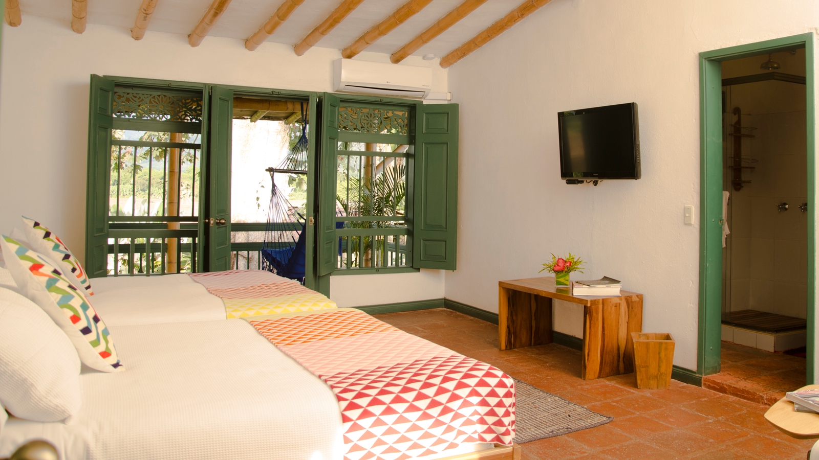 The main house, built in the vernacular style with bamboo guadua and clay tiles, has just eight rooms. Each has a private bathroom, balcony, a small sitting area and a hammock for lazy afternoons listening to the birds before dinner is served.