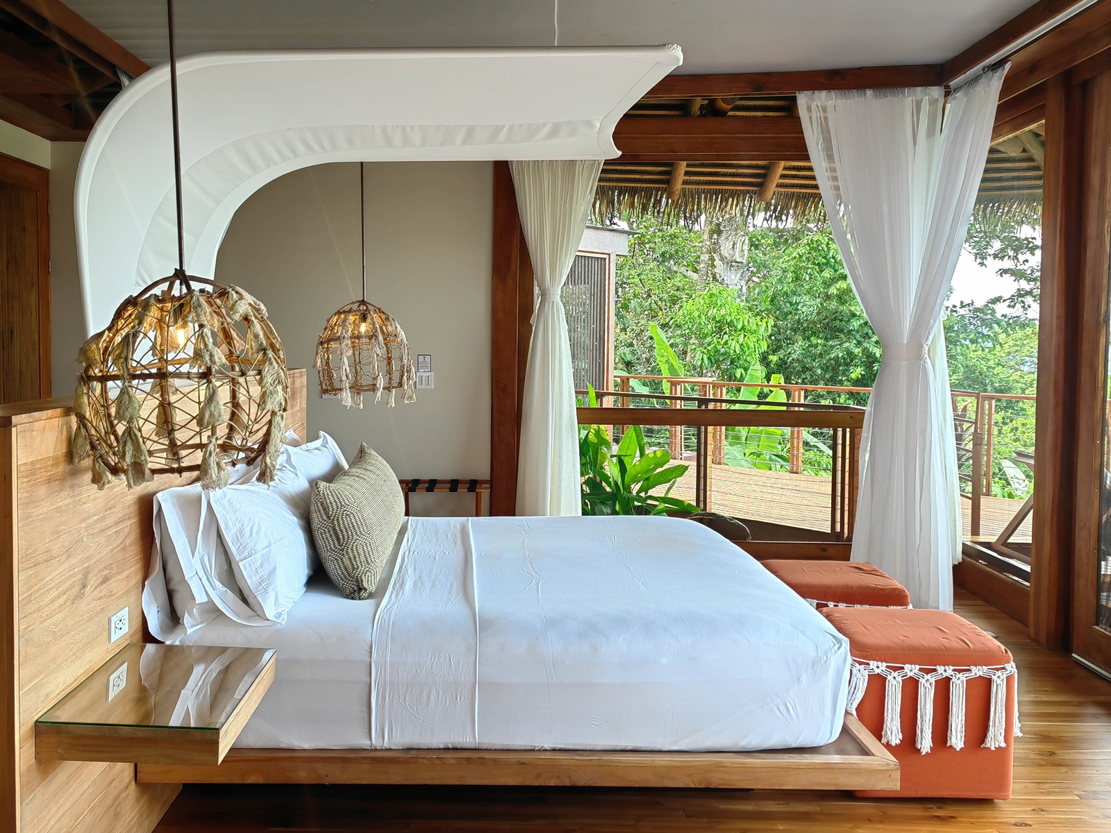 The hotel and each bungalow have sweeping views of the Pacific and rainforest canopies, and it’s a short downhill walk to a quiet and beautiful beach for a dip in the ocean.