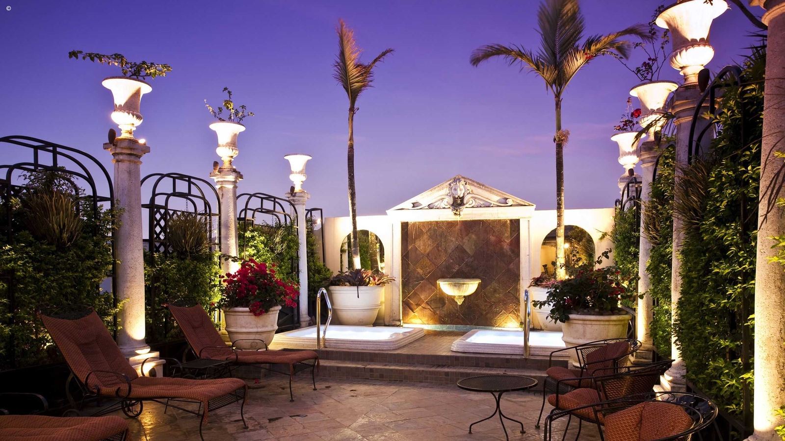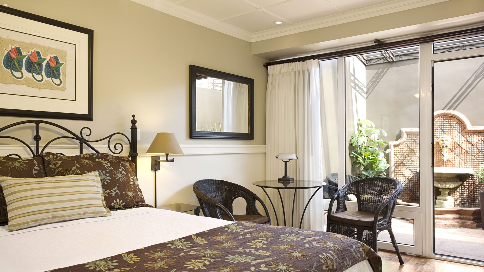 On the ground floor is the restaurant with half its tables set in the hotel’s charming atrium circling a Spanish-tiled fountain surrounded by stained glass windows and the shuttered corridor balconies spilling over with vivid green plant life. The chef is French, the menu extensive, and its tables are often frequented by locals as well as guests. At night the rooftop terrace is a great place to relax, have a drink or try out the Jacuzzi.