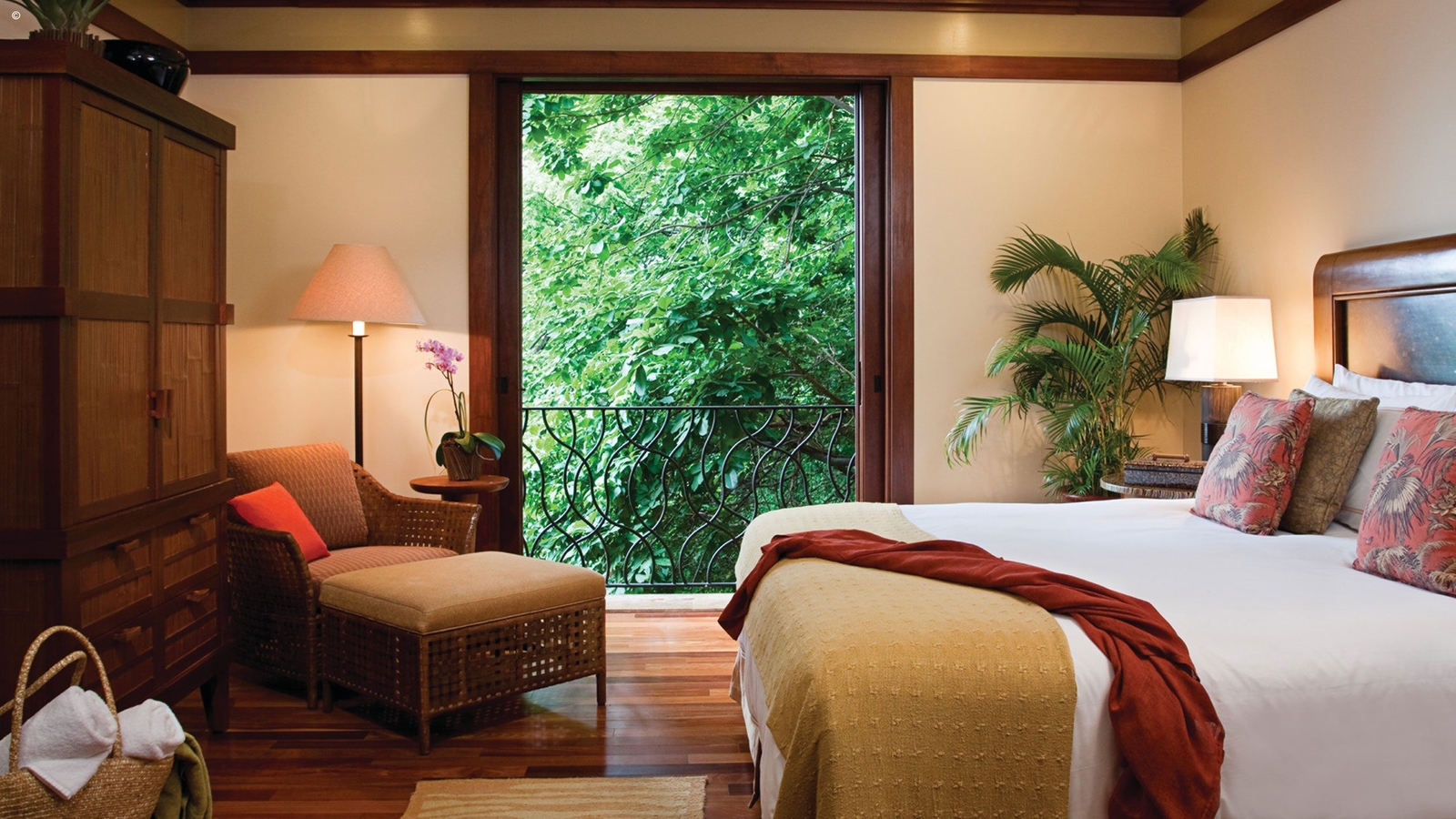 Papagayo is a vivid green spit of land that winds into the Pacific blue, decorated with idyllic golden beaches of which the hotel has direct access to two. The hotel’s 182 guest rooms, suites and villas are smart and luxurious, incorporating lots of Costa Rican and tropical style with the use of bamboo, rattan, solid wood furniture, shuttered windows and doors. Stone finishes and beige tones are broken up by the occasional vivid splash of colour.