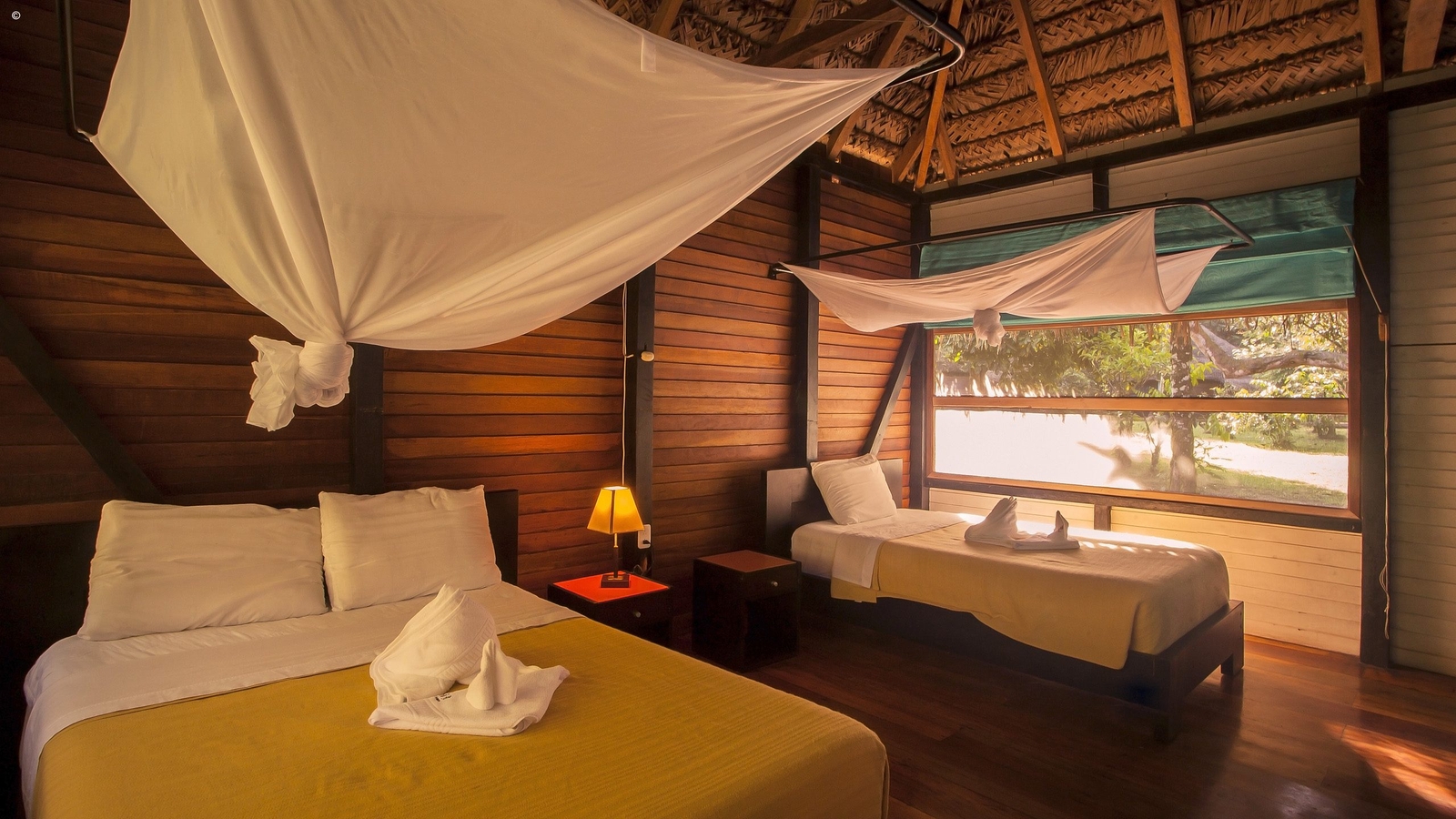 Make yourself at home in a rustic, yet spacious cabin, offering an intimate experience of the Amazon rainforest. Up to 38 guests can be accommodated in thatched-roofed cabanas and family-sized cabins, which are all screened to keep insects out and have eco-friendly solar lights. Warm fabrics and rich wood panels made for an inviting place to relax as you take in the sounds of the jungle.
