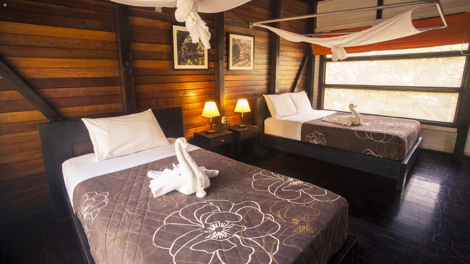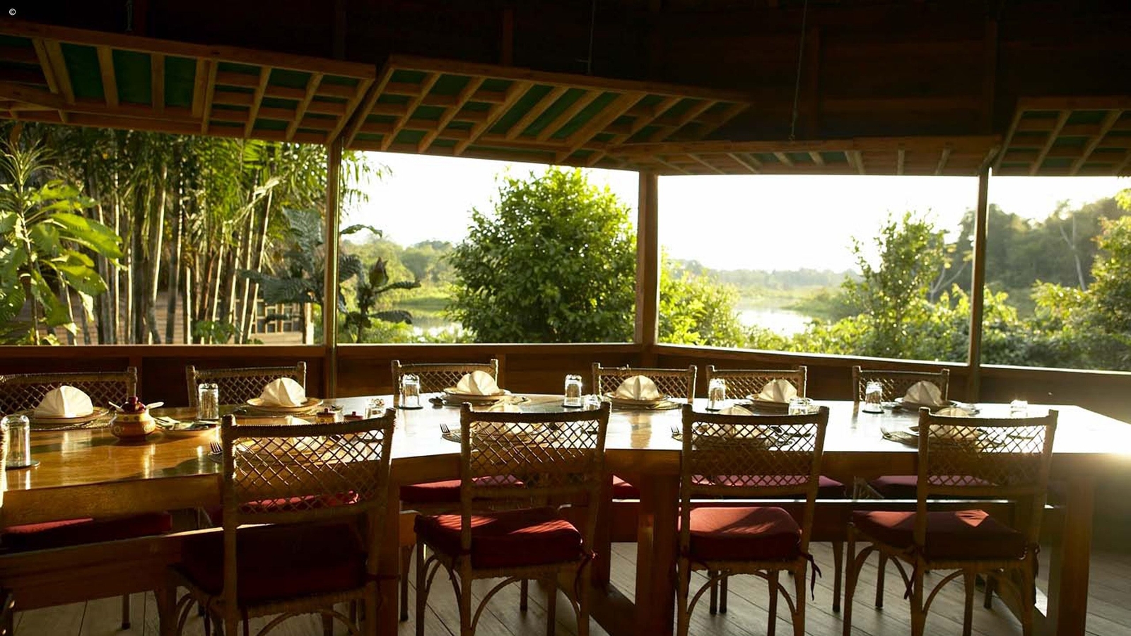 Make yourself at home in a rustic, yet spacious cabin, offering an intimate experience of the Amazon rainforest. Up to 38 guests can be accommodated in thatched-roofed cabanas and family-sized cabins, which are all screened to keep insects out and have eco-friendly solar lights. Warm fabrics and rich wood panels made for an inviting place to relax as you take in the sounds of the jungle.