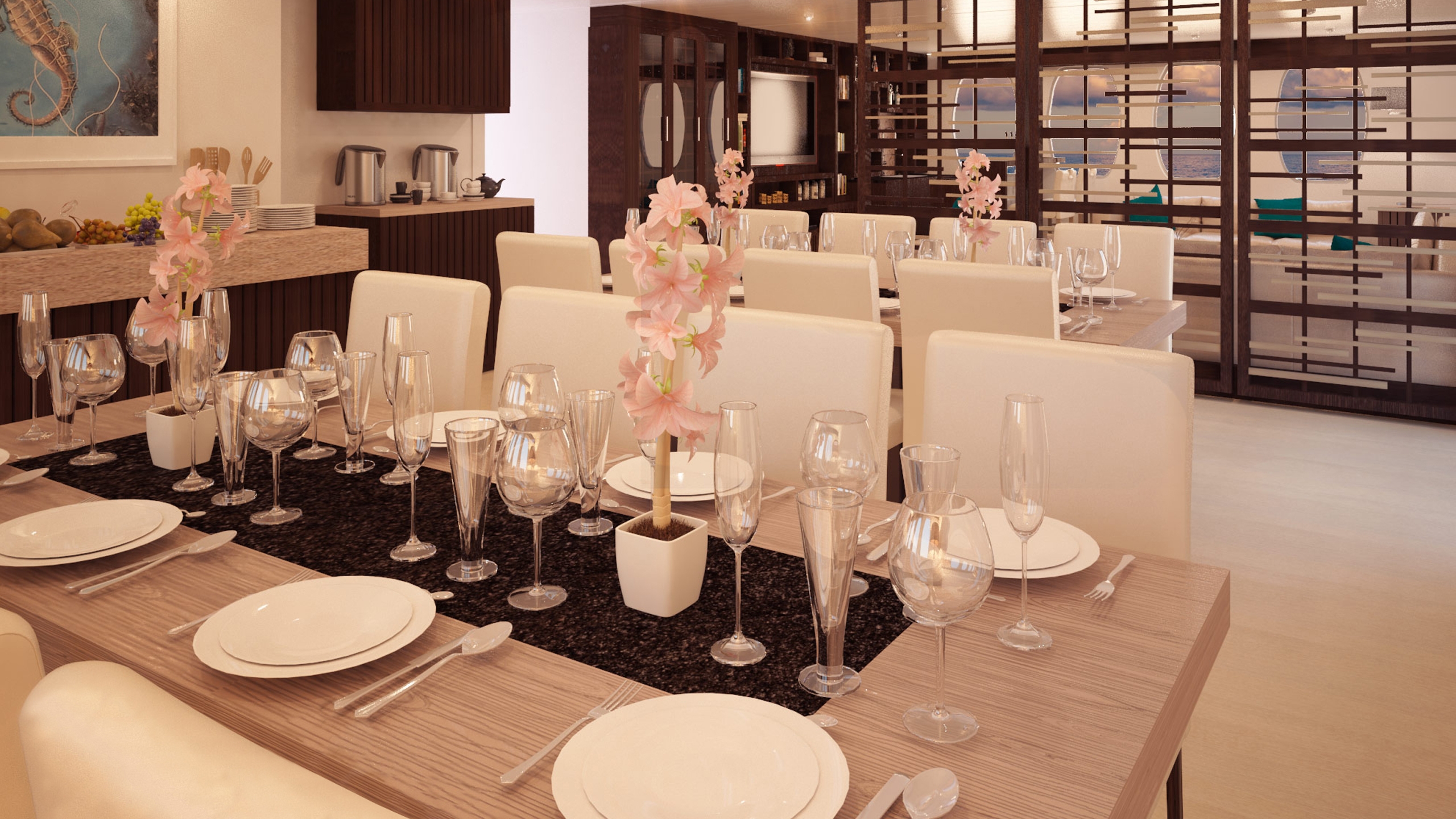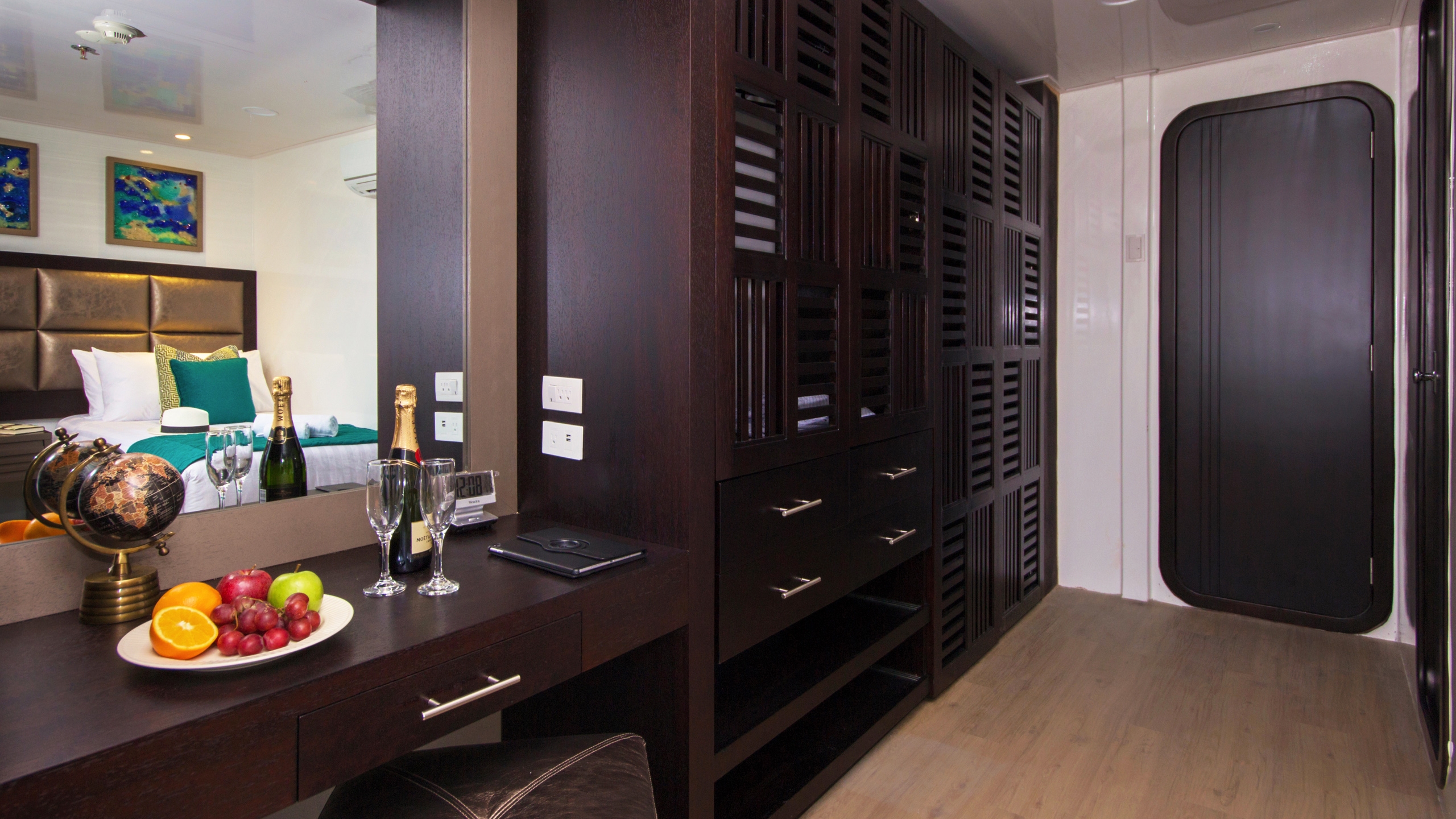 The 105-foot catamaran accommodates up to 16 guests in nine comfortable en-suite cabins, eight of which feature private balconies. Rooms are bright and fresh with large windows that allow plenty of natural light to flood in.