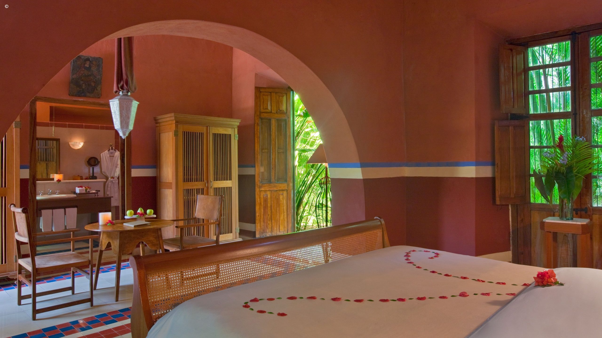 The main house sits amidst lush tropical gardens, with stone pathways leading to tranquil courtyards and a striking swimming pool. The hacienda’s 15 guest rooms retain their 19th-century layout and aesthetic of earthy hues, airy interiors and handcrafted furnishings. For those seeking further seclusion, four original Mayan villas have been lovingly repurposed into private suites. Each features a shaded terrace, outdoor Jacuzzi and garden views that offer a sanctuary surrounded by centuries-old ceiba trees and stone walls laced with vines.
