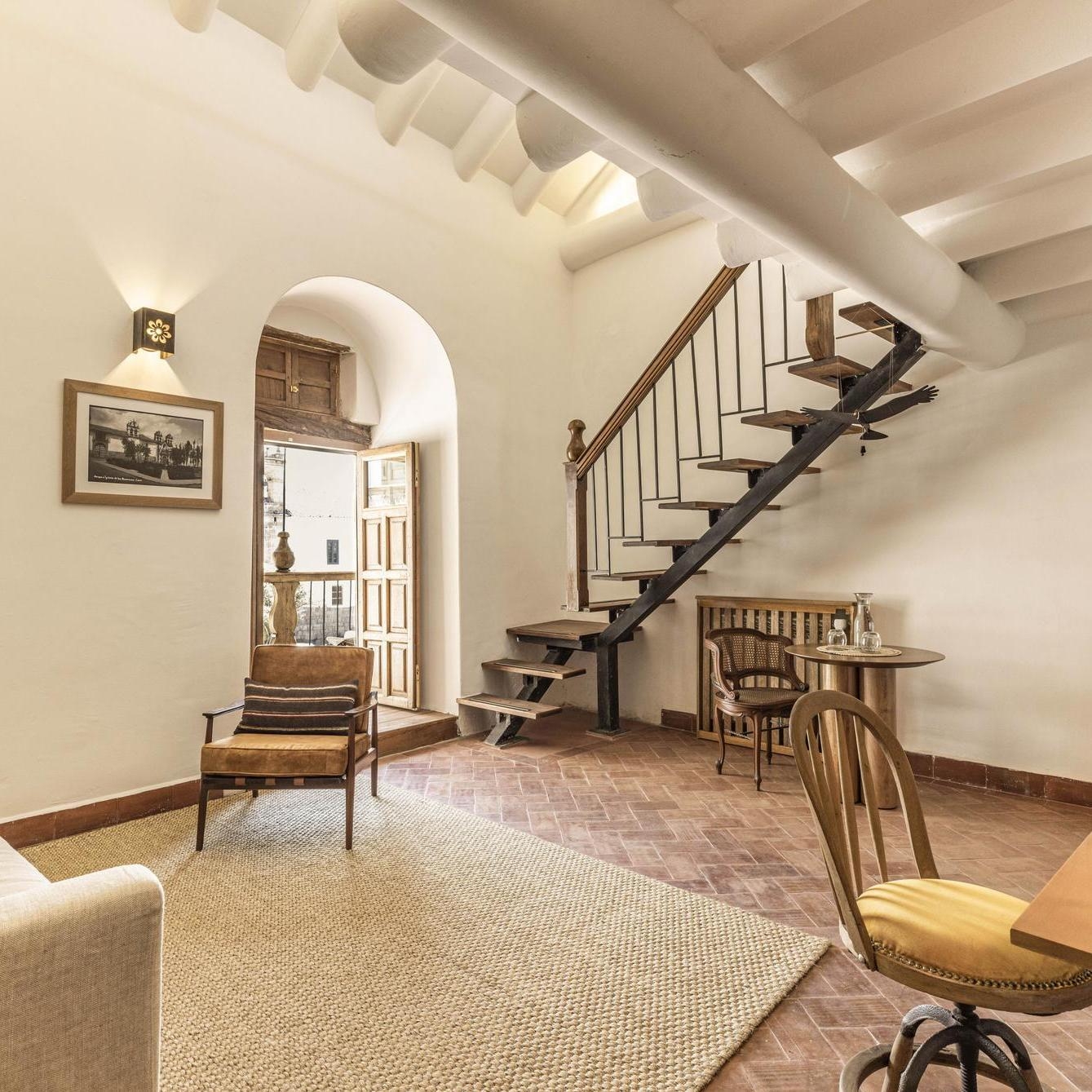 From a Balcony Suite, the largest of the collection, you can look across the peaceful Plaza Nazarenas. A carved door opens into its separate living area, whose staircase leads up to a bedroom raised on a mezzanine level.