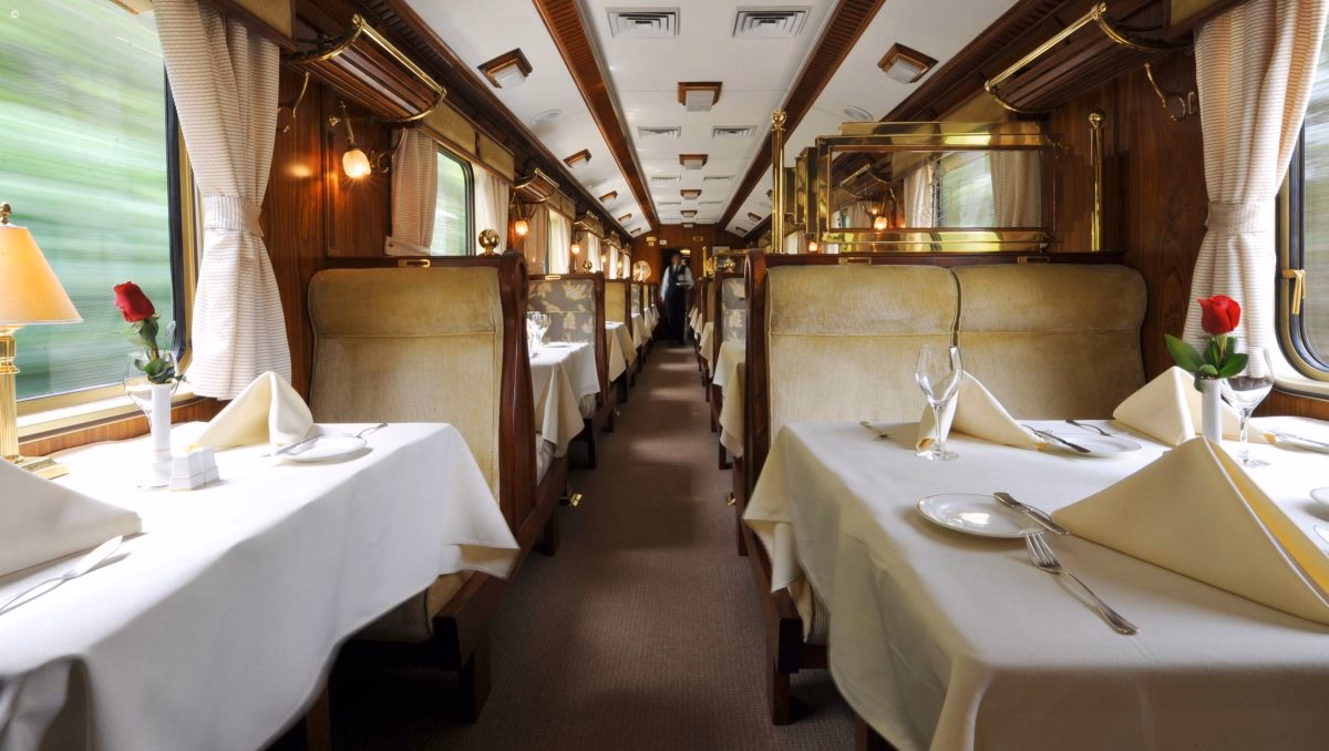 Aboard, the 1920s Pullman carriages reflect the opulence of the locomotive era bedecked in polished brass, wood panels and rich, comfy seating. There is also a period observation car at the rear.
