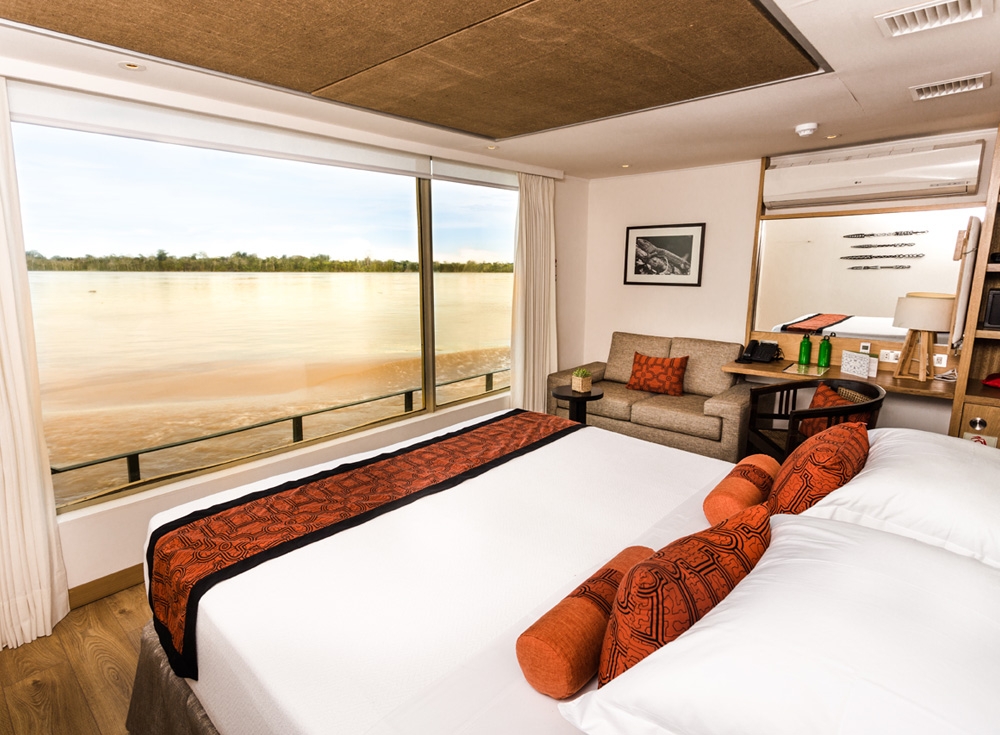 On the upper deck, you’ll find the dining room which serves the gourmet cuisine Peru is renowned for and on the top deck a beautiful indoor and outdoor lounge, a sundeck with plunge pool, a spa and small gym, and the bar.