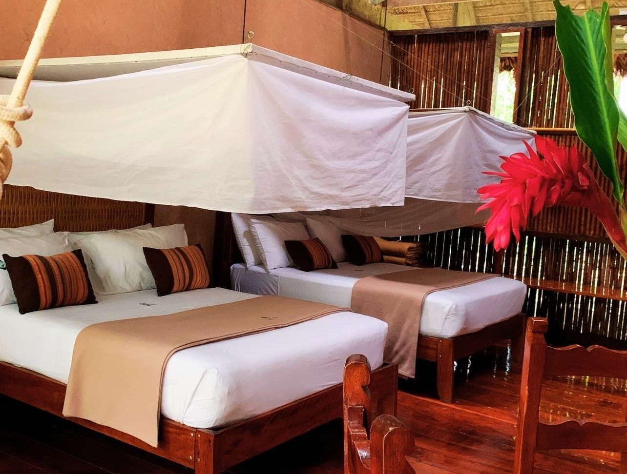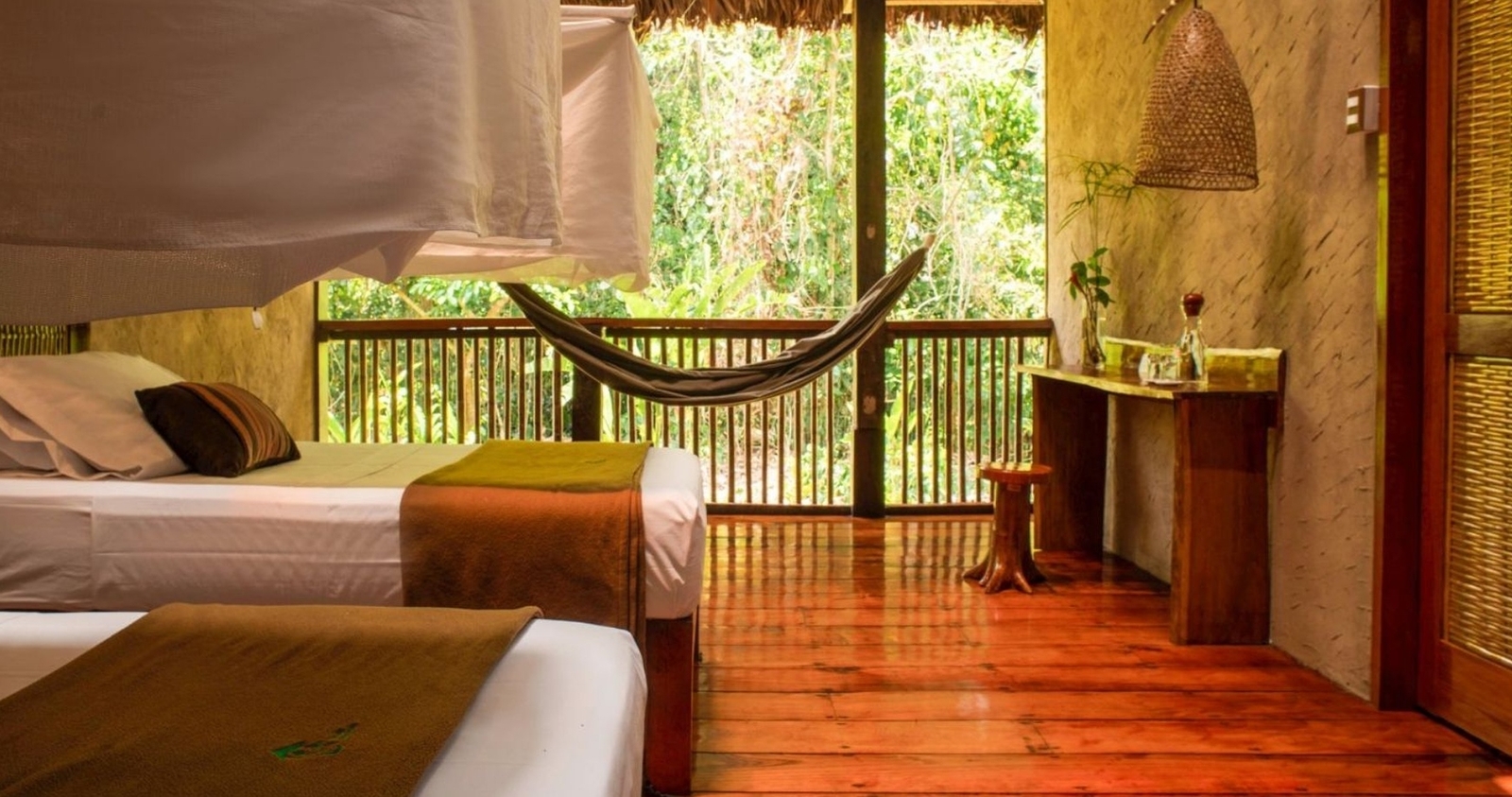 Just getting to Posada Amazonas is an adventure, as you’ll embark on a 45-minute boat journey along the Rio Tambopata to reach its welcoming wooden decks. Once here, you’ll be greeted by the local community who make up much of the staff at the lodge, and shown to your room where swinging hammocks and handmade wooden beds await.