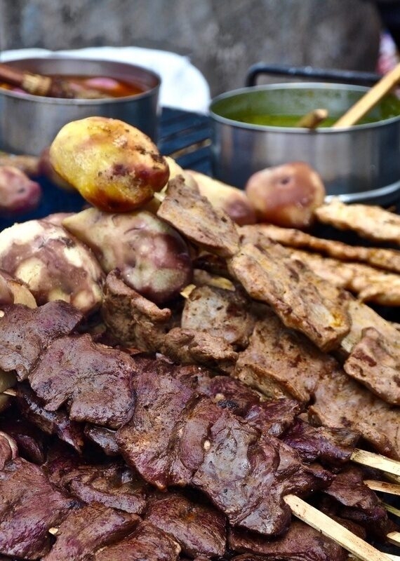 Along the way you might try tamales or pan con chicharrón (a sandwich with crispy pork and sweet potato), both of which are often accompanied by salsa criolla (red onion, ají amarillo, lime juice and cilantro). We also suggest sampling the legendary anticuchos: skewered beef hearts in a zesty marinade. For something a bit more soothing, grab a cup of steaming emoliente from a street vendor; this thick herbal brew is said to heal anything from a cold to indigestion.
