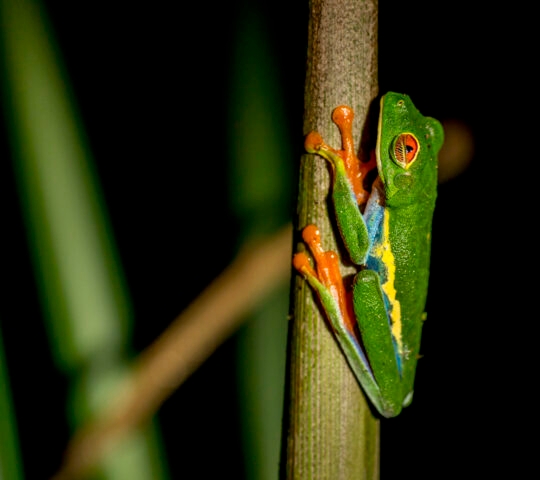 The trail behind Tortuga Lodge is 1.4 miles or 2.2km long. Depending on what you are seeing along the way it can take anywhere from 1 to 2.5 hours. Common sighting are the several species of frogs that might occur at night like the smokey jungle frog and the red eyed tree frog, as well as snakes and other reptiles. It is also possible to observe some mammals like insectivorous bats and marsupials like the common opossum and mouse opossum. Additionally, the night-time hours offer a myriad of insects including the peanut headed bug, the tailless whip tailed scorpion and a host of katydids. On your return to the lodge your guide will take you to the dock where you may be able to see fishing bats hunting.