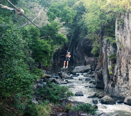 The trip takes you from deep within the narrow canyon into the convergence, where the hot waters of Rio Perdido and the Yurro Waterfall meet the cool waters of the White Canyon. You then ascend well above Costa Rica’s only dwarf forest and get the spectacular views of the Miravalles Volcano’s rocky lowlands. You will zip-line down state-of-the-art carbon fibre cables, swing on a human pendulum and do a Tarzan swing, cross the wobbly challenge bridge and climb several via ferratas.