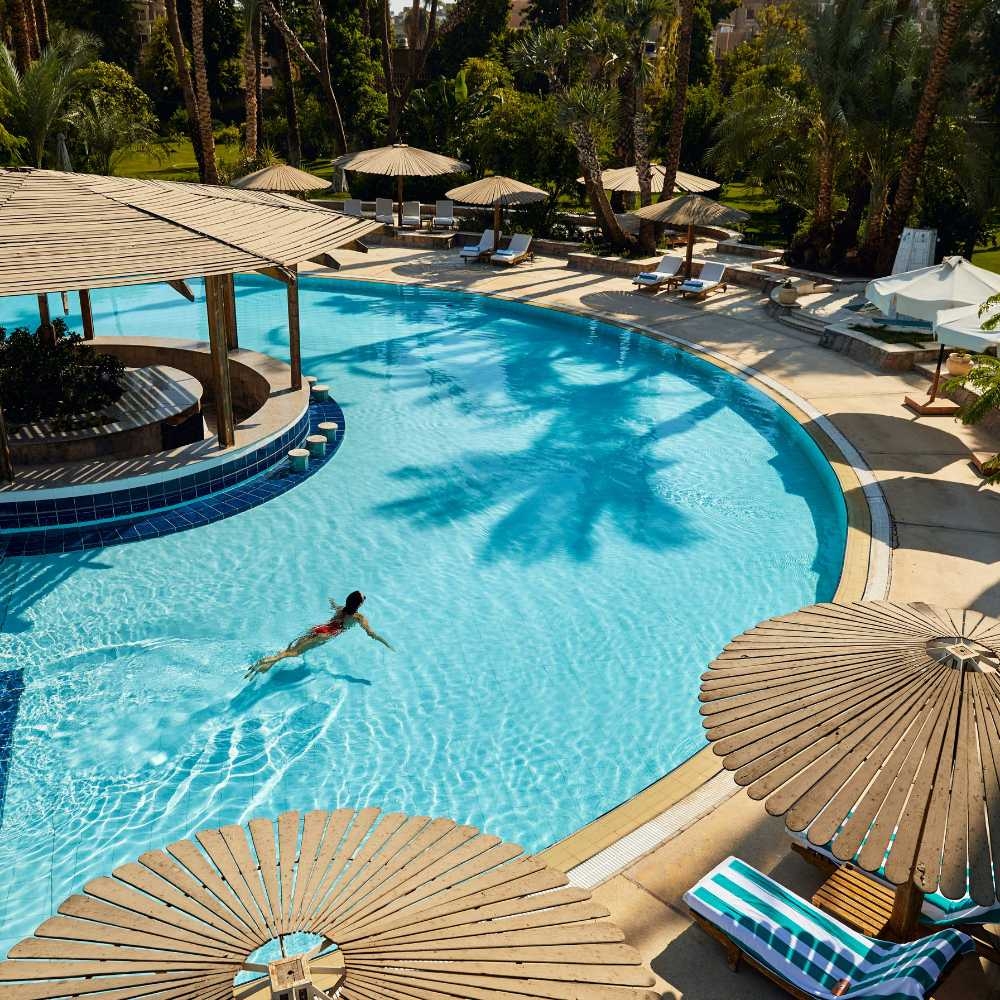 There are 5 restaurants at the hotel with additional options to enjoy either room service or private meals set under a lavish pagoda swathed in rich fabrics within the hotel gardens. There’s the chance to dine inside at the formal 1886 restaurant and La Corniche restaurants, and the choice to dine al fresco at El Nakhel, Shisha Corner and the Nile Terrace Bar. Guests can also relax by the stunning outdoor swimming pool, surrounded by palm trees and with comfortable beds and parasols for shade. There’s a swim up bar serving refreshing cocktails and delicious gourmet snacks too.