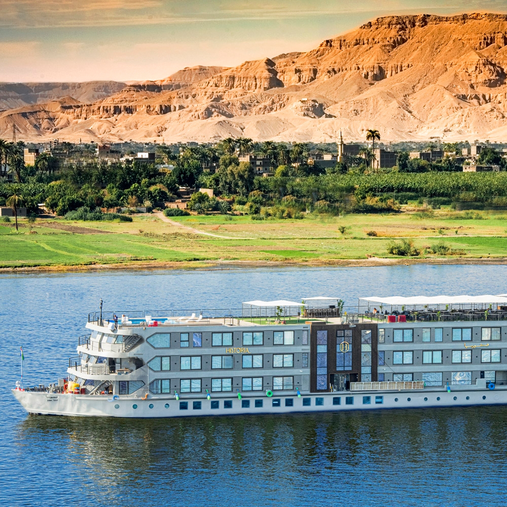 Surrounded by ancient history beyond the banks of the Nile, allow yourself to relax on board the Historia where Egyptian-inspired furniture hints at the past and luxurious furnishings offer you a comfortable cruise experience. Think fluttering curtains, perforated rattan screens and a colour palette of earthy shades with jewel tone highlights.