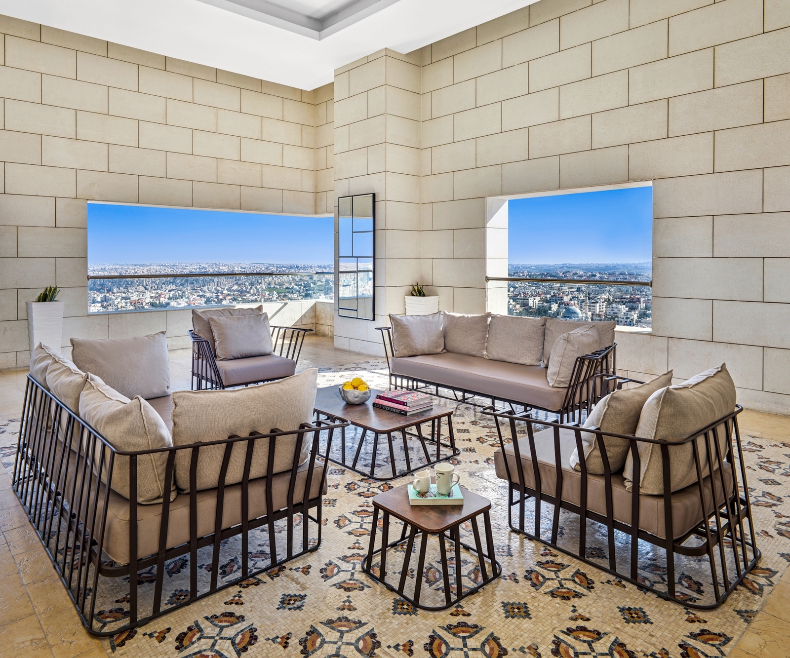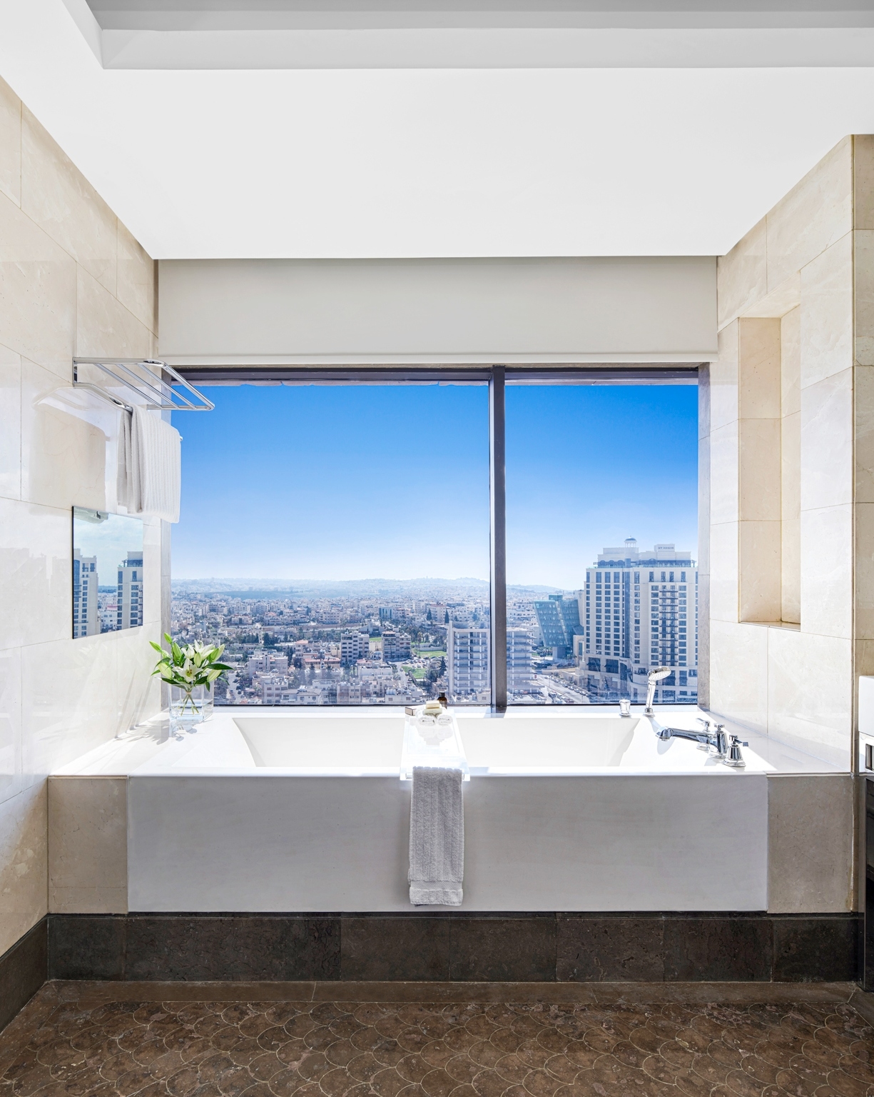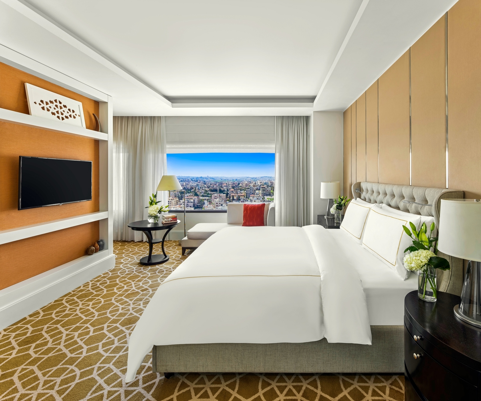 Fairmont Amman is a luxury hotel nestled within the capital of Amman. There are 317 guest rooms and suites available for you to stay in, ranging from the Fairmont Room, with its contemporary furnishings and large windows that pull your eyes to the city outside, to the Amman Suite. This suite is found on the 15th floor and features an exclusive butler service, a separate living space, and a marble bathroom. There are also the Fairmont Gold Rooms which boast beautifully carved mirror televisions in both the bath tub and the bedroom, along with access to premium amenities such as a private lounge.