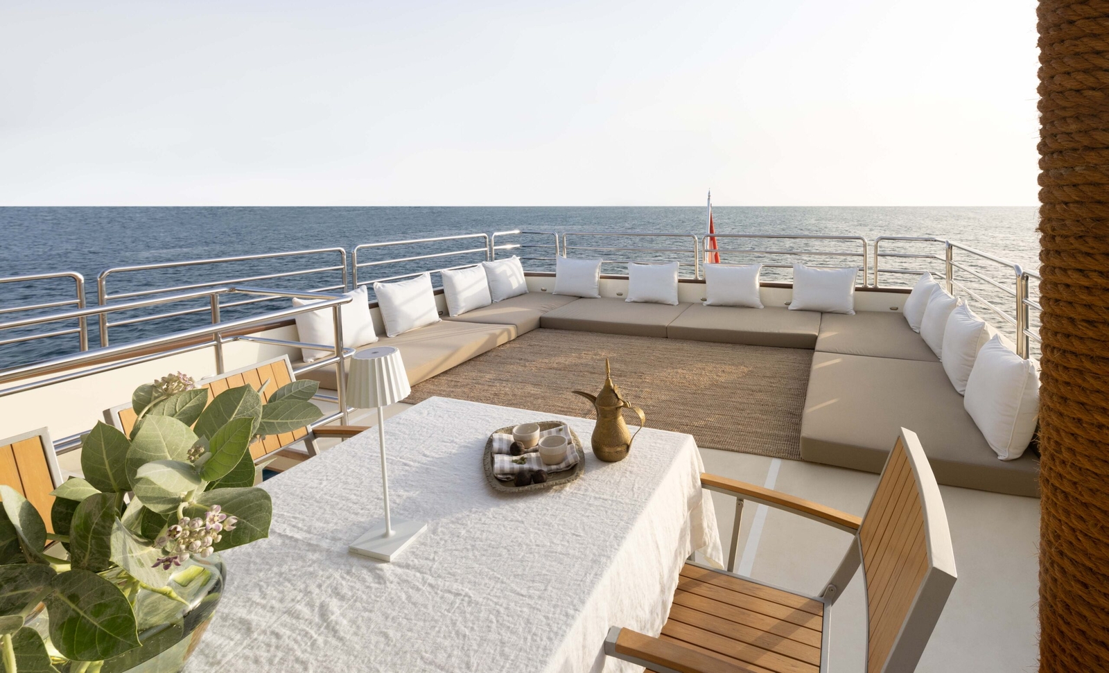 This modern dhow can accommodate up to 40 guests for day cruises, and for overnight charters it can sleep up to eight people in four guest cabins: two doubles and two twins. Each room boasts an en-suite. You’ll be well taken care of by your captain, host, chef and deckhand.