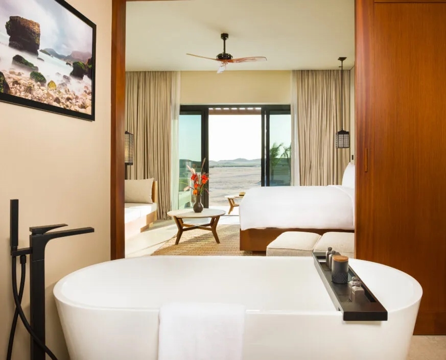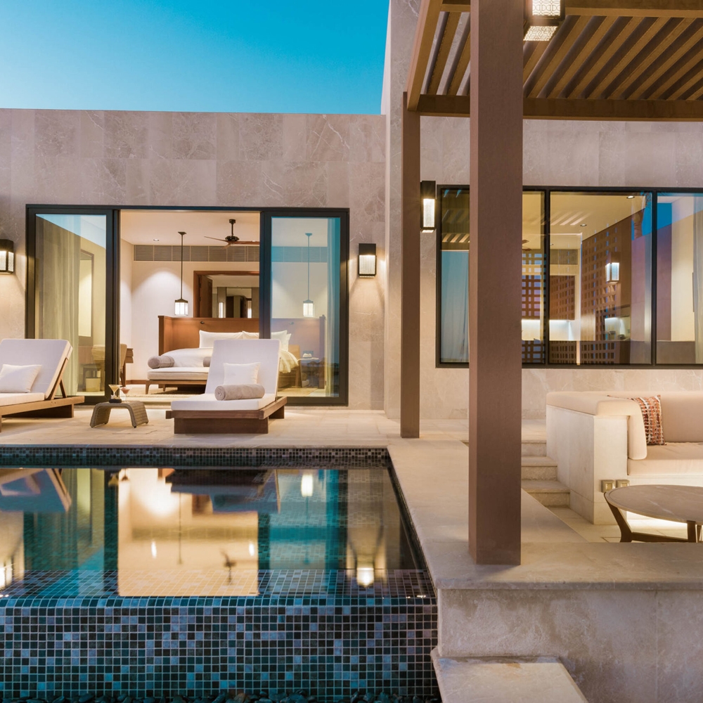 Alila’s architecture is striking: minimalist and modern but with Arabic influence, you’ll find perfectly-curved archways alongside crisp lines and clean, neutral colours which complement the desert landscape around you. Inside its 112 bedrooms, soft gowns and deep tubs add personal luxury, and outside are views of the rugged rocks or dreamy Arabian sea.