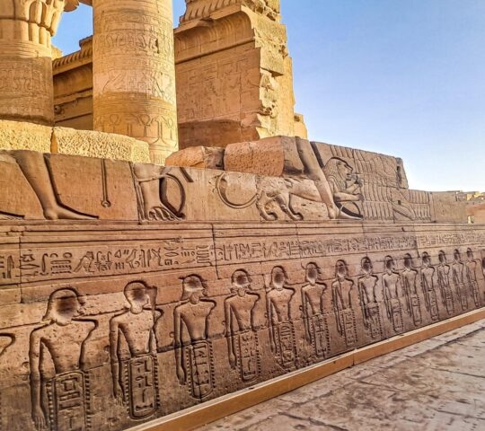 The enchanting temple of Kom Ombo lies midway between Luxor and Aswan.It’s dedicated to both Horus, the falcon god, and Sobek, the crocodile god, who represents earthly instincts and was revered out of fear. This unique double temple embodies the idea that good and bad reside within each of us. To honour Sobek, priests once selected living crocodiles to reside in this sacred space. Today, preserved crocodile mummies can be seen at the adjacent museum.