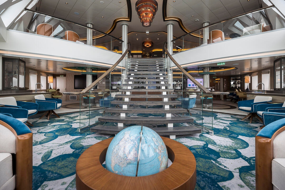 The 70 comfortable cabins can accommodate up to 132 guests. In addition to inviting communal areas, there is a modern lecture lounge, zodiac launching platforms, a restaurant, a gym and a wellness centre.
