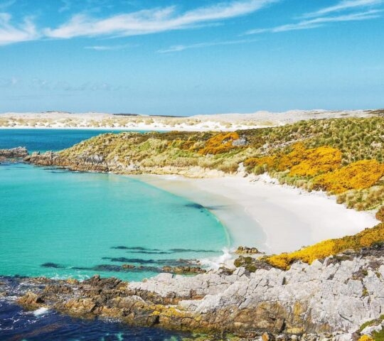 Explore some of the westernmost settled outposts in the Falkland Islands, where you can marvel at picturesque bays and wild coastlines. Along the way, keep your eyes peeled for black-browed albatrosses and rookeries of rockhopper, king and Magellanic penguins.