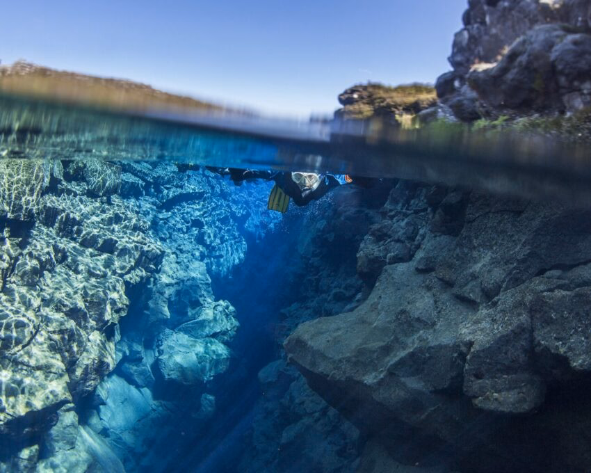 Snorkel in some of the clearest water on the planet in Silfra, a tectonic rift valley in Þingvellir National Park, down a narrow canyon in the lava field located between the continents of America and Europe. The water in Silfra is a mixture of groundwater from the surrounding area and meltwater from Langjökull glacier in the highlands. It takes the glacial water decades to filter through the massive lava field before it enters the fissure. This makes the water in Silfra one of the purest and clearest in the world, the underwater visibility, in the heavenly blue water, is normally 70-80 meters, better than anywhere else in the world.